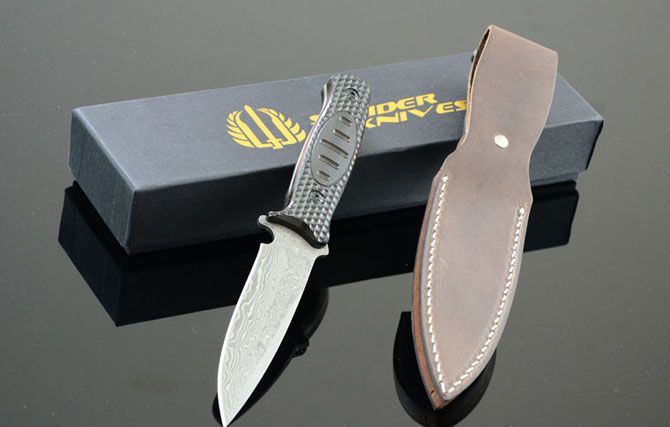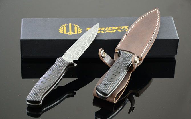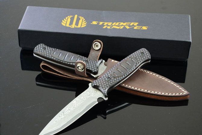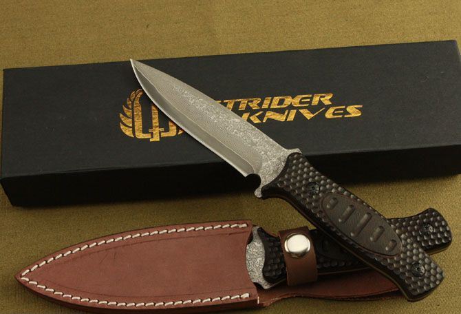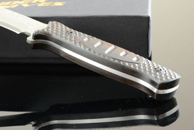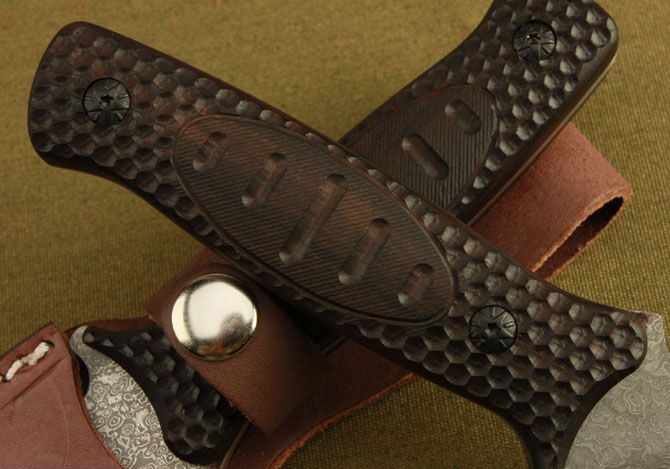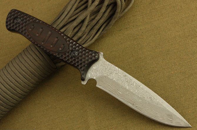 米克—103小直 全 长: 23cm 刃 长: 12cm 柄 长: 11cm 刃 宽: 2.9cm(最宽处) 硬 度: 58HRC 刃 厚: 0.3cm 柄 材: 木柄 重 量: 228克(含皮套) 刃 材: 大马士革钢 表 面: 大马士革钢特有的花纹原色 其 他: 真皮套,高档包装盒