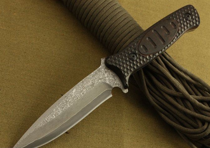 全 长: 23cm 刃 长: 12cm 柄 长: 11cm 刃 宽: 2.9cm(最宽处) 硬 度: 58HRC 刃 厚: 0.3cm 柄 材: 木柄 重 量: 228克(含皮套) 刃 材: 大马士革钢 表 面: 大马士革钢特有的花纹原色 其 他: 真皮套,高档包装盒