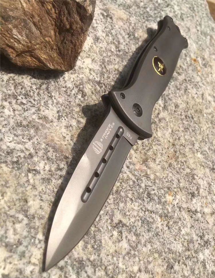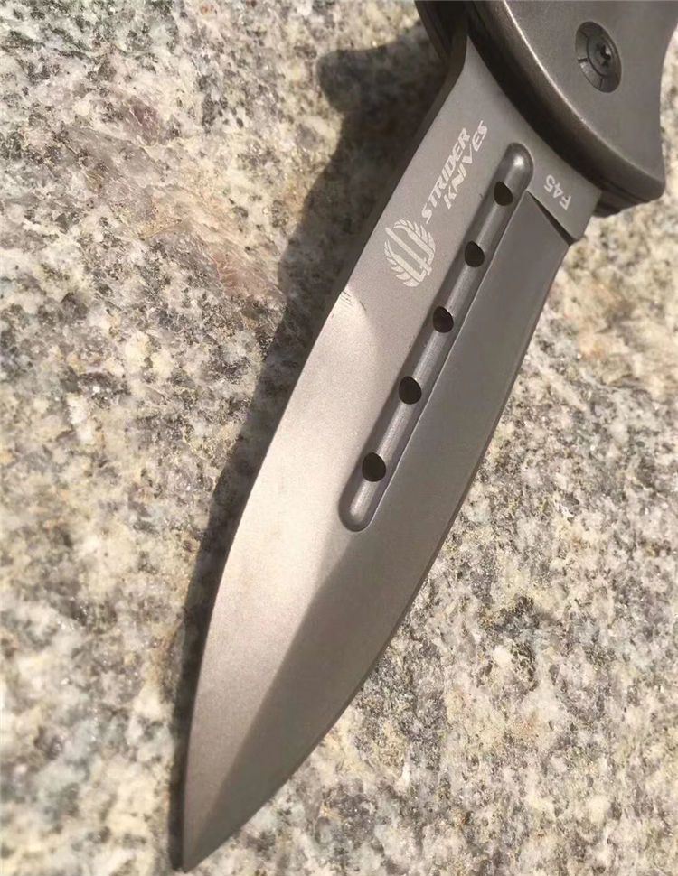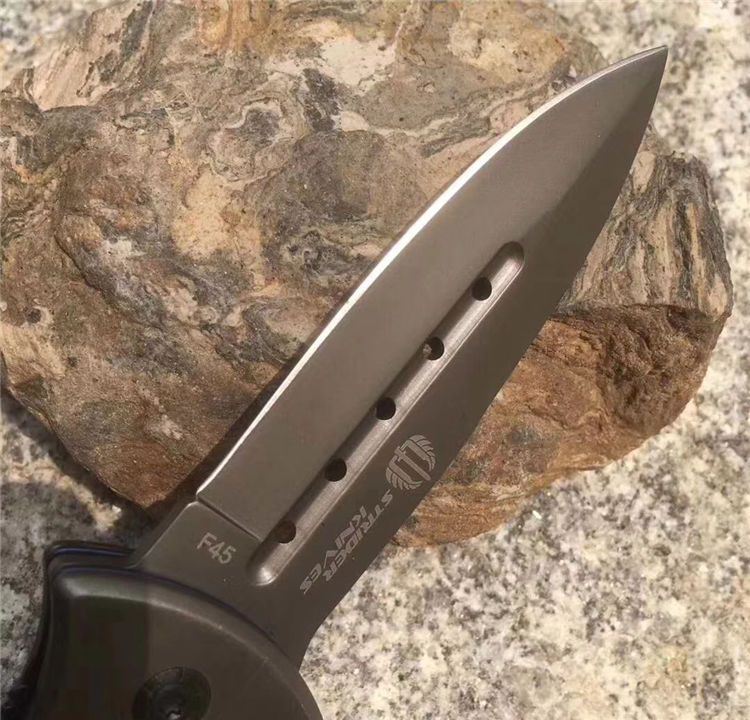 米克F45折刀 刃材:3Cr13 硬度:56HRC 全长:22CM 刃长:9CM 刃厚:0.25CM 刃宽:2.5CM (最宽处) 柄长:13CM 重量:140克 涂层:钛离子 柄材:全钢 锁定:快开