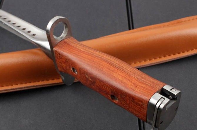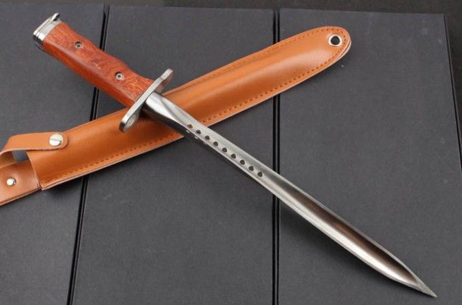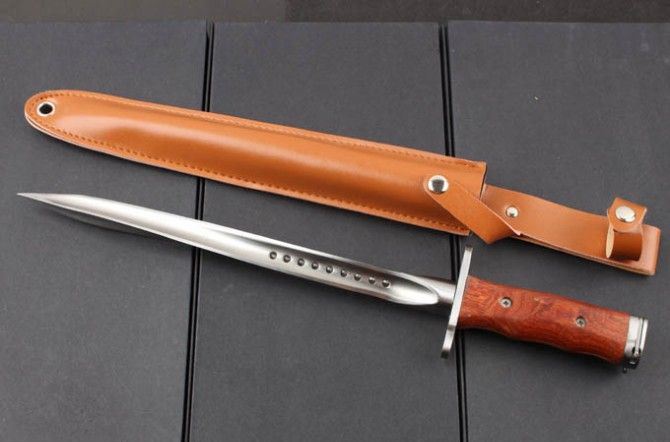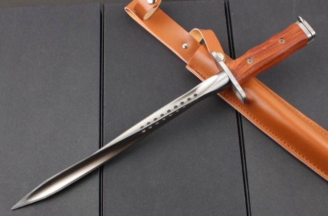 五六螺旋三棱军刺(原木柄) 全长:40CM 刃长:28.5CM 刃材料:三棱刃不锈钢,螺旋状 柄长:11CM 重量:450克 刀鞘:PU皮