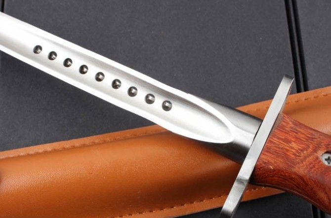 全长:40CM 刃长:28.5CM 刃材料:三棱刃不锈钢,螺旋状 柄长:11CM 重量:450克 刀鞘:PU皮