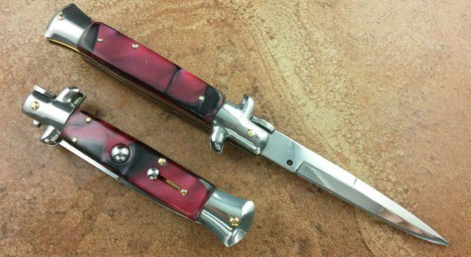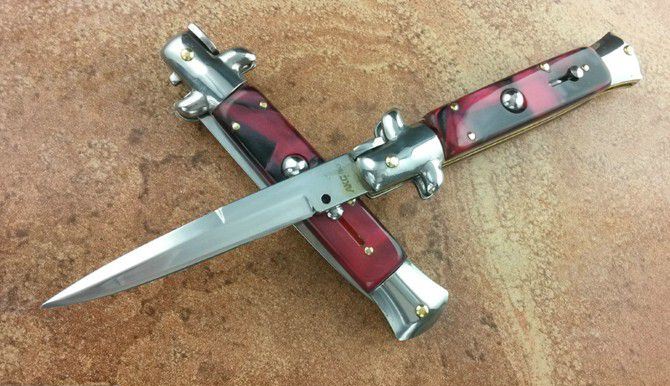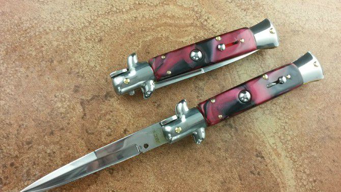 9寸AKC意大利跳刀(玛瑙红柄) 全 长:22.9mm 刃 长:10.2mm 柄 长:325px 刃 宽:30px(最宽处) 刃 厚:3.0mm 刃 材:440 刀 柄:亚力克玛瑙红 开刀方式:弹簧 重 量:150克