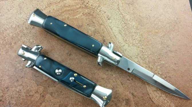 9寸AKC意大利跳刀(墨水绿柄) 全 长:22.9mm 刃 长:10.2mm 柄 长:325px 刃 宽:30px(最宽处) 刃 厚:3.0mm 刃 材:440 刀 柄:亚力克墨水绿蓝 开刀方式:弹簧 重 量:150克
