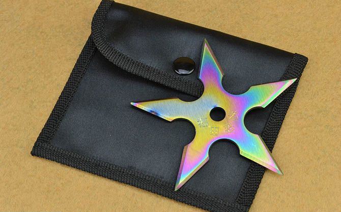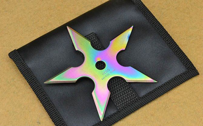 直径:9cm 镖厚:0.24mm 材料:420不锈钢 表面处理:彩钛 重量:53克(含包装) 包装:忍者尼龙套 备注:镖锋开刃 此镖五星造型,做工精细,镖锋对称大小合手,旋转性很好! 合理的重量和角度让你投掷起来既顺手又准确!