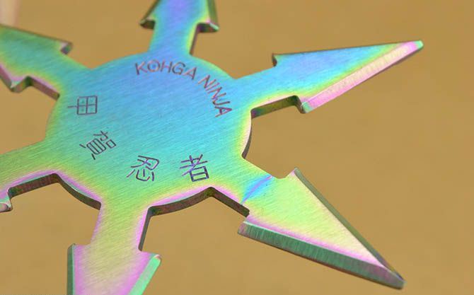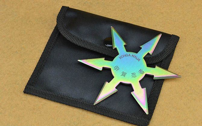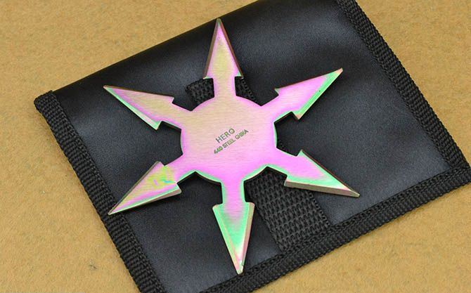 甲贺忍者.六星飞镖(彩钛版) 直径:10cm 镖厚:0.25mm 材料:420不锈钢 表面处理:彩钛 重量:62克(含包装) 包装:忍者尼龙套 备注:镖锋开刃 此镖六星造型,做工精细,镖锋对称大小合手,旋转性很好! 合理的重量和角度让你投掷起来既顺手又准确!