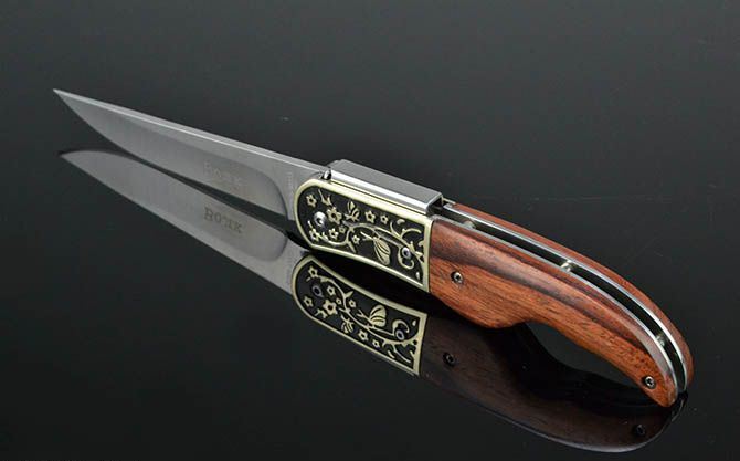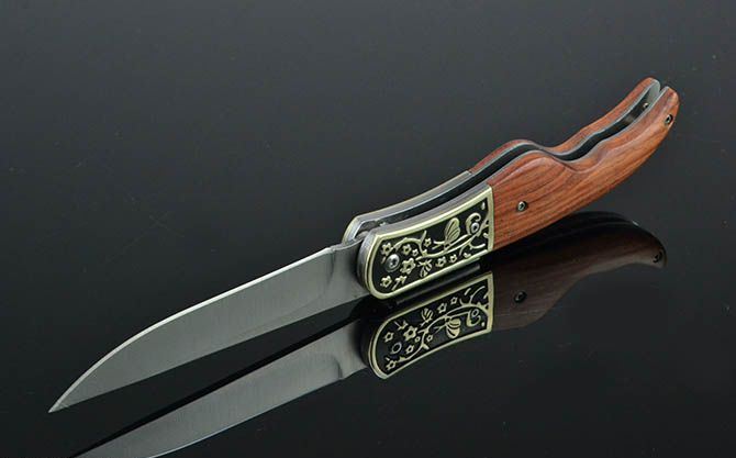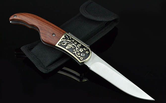 全 长: 21.8cm 刃 长: 9cm 刃 宽: 2cm(最宽处) 闭 合: 12cm 硬 度: 56HRC 刃 厚: 0.28cm 重 量: 154克(含包装) 包 装:尼龙套 表 面: 砂光 刃 材: 3CR13 柄 材: 雕花黄铜+酸枝木 锁 闭: 背锁