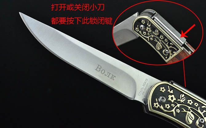 Bojik.FB0092T折刀 全 长: 21.8cm 刃 长: 9cm 刃 宽: 2cm(最宽处) 闭 合: 12cm 硬 度: 56HRC 刃 厚: 0.28cm 重 量: 154克(含包装) 包 装:尼龙套 表 面: 砂光 刃 材: 3CR13 柄 材: 雕花黄铜+酸枝木 锁 闭: 背锁