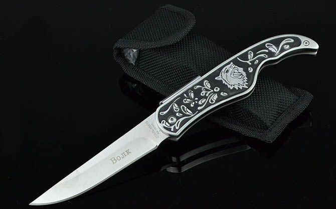 Bojik.FB0090折刀 全 长: 21.8cm 刃 长: 9cm 刃 宽: 2cm(最宽处) 闭 合: 12cm 硬 度: 56HRC 刃 厚: 0.28cm 重 量: 205克(含包装) 包 装:尼龙套 表 面: 砂光 刃 材: 3CR13 柄 材: 雕花+全钢 锁 闭: 背锁