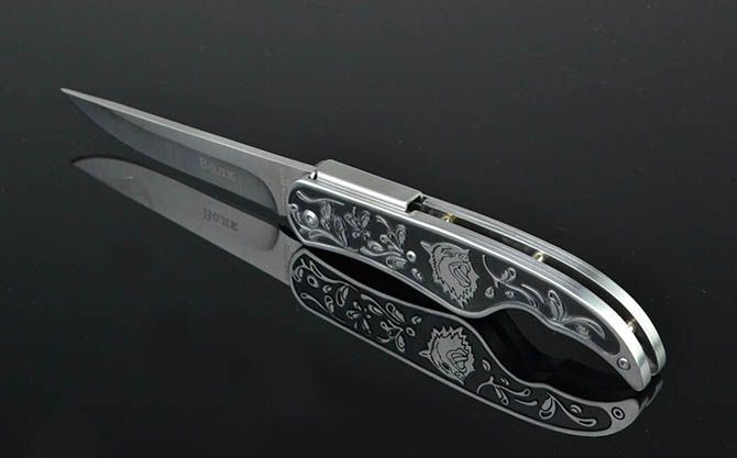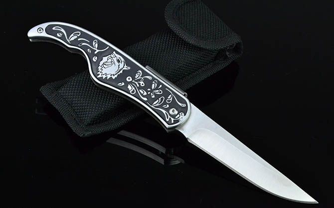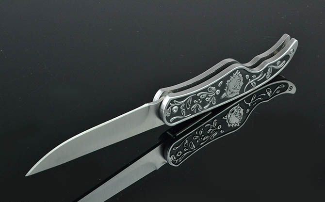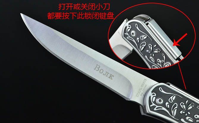 全 长: 21.8cm 刃 长: 9cm 刃 宽: 2cm(最宽处) 闭 合: 12cm 硬 度: 56HRC 刃 厚: 0.28cm 重 量: 205克(含包装) 包 装:尼龙套 表 面: 砂光 刃 材: 3CR13 柄 材: 雕花+全钢 锁 闭: 背锁