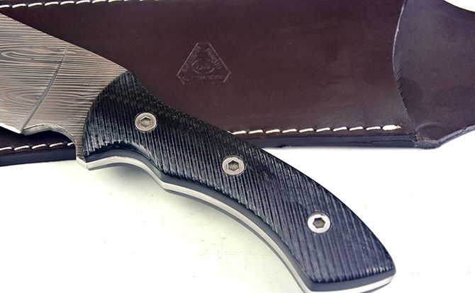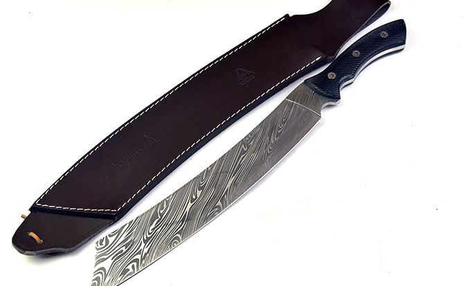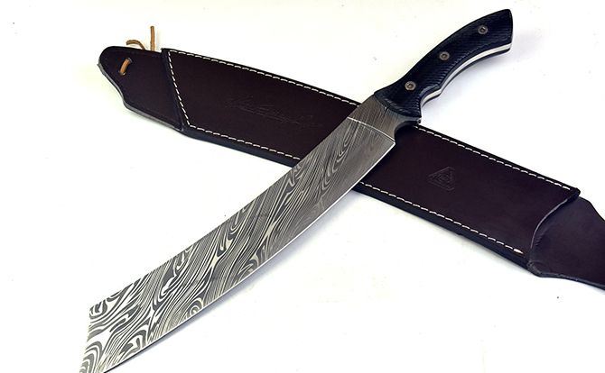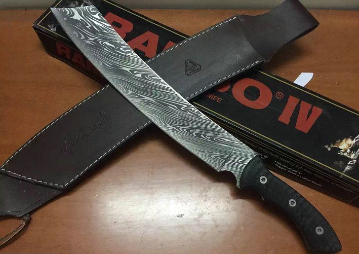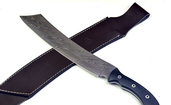 全 长:505mm 刃 长:355mm 柄 长:150mm 刃 宽:55mm 刃 厚:5.5mm 刃 材:5Cr13Mov 重 量:950克(含包装) 硬 度:55HRC 表 面:腐蚀纹 柄 材:G10柄 锁 型:定锁 其 他:配纸盒和皮套