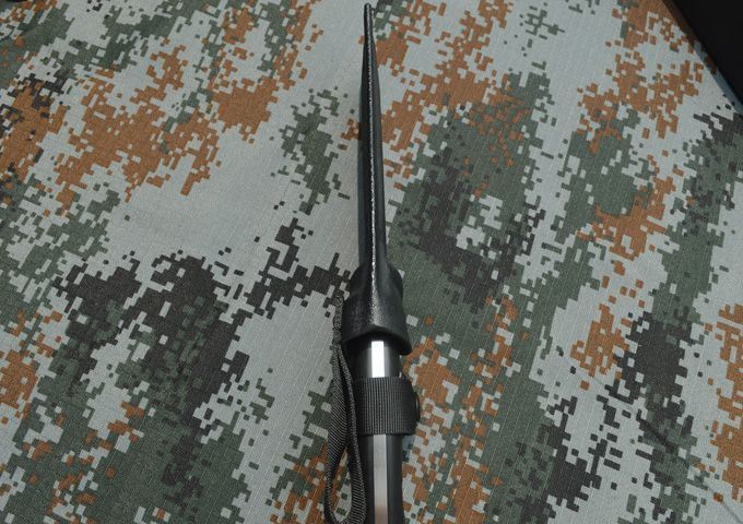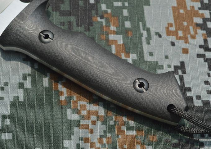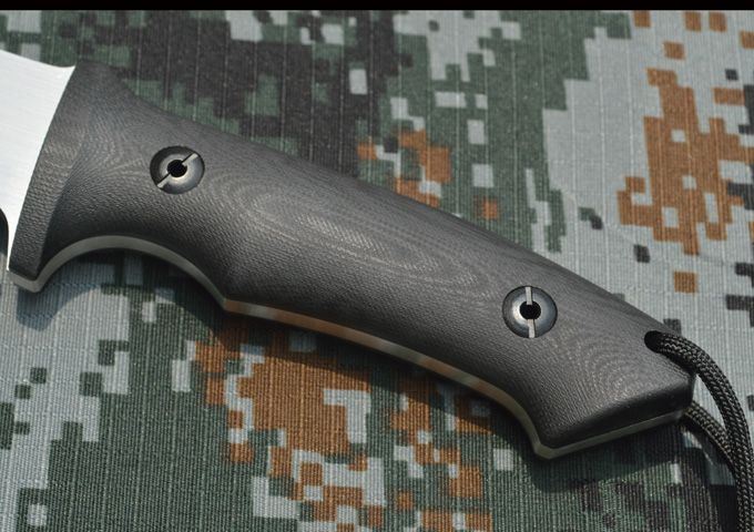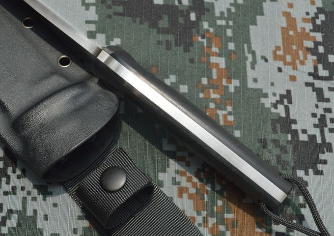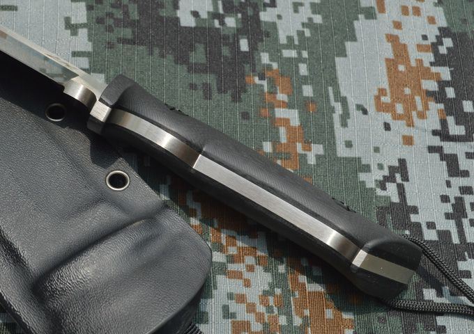 刃材:A2 全长:26.5cm 刃长:13.5cm 刃厚:0.53cm 表面:砂光、缎面拉丝 硬度:59-60hrc (真空油淬热处理) 手柄:G10 刀鞘:进口Kydex鞘