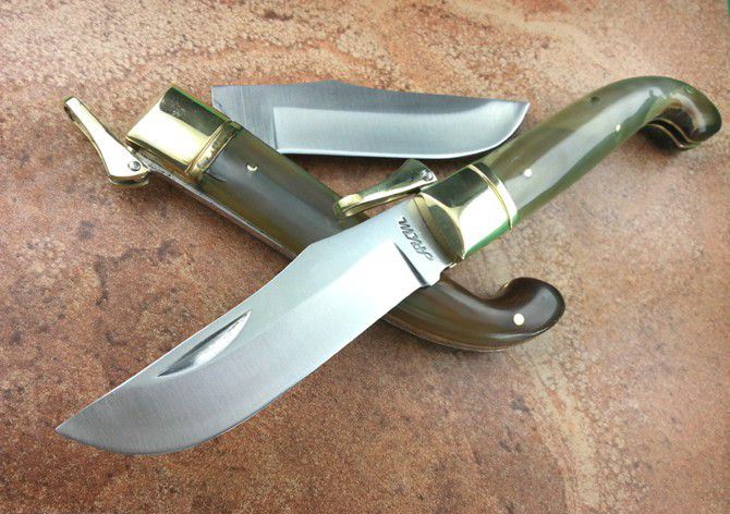 AKM意大利古典折刀(轴锁款), 源自1930年设计的古董款式,手柄制作非常考究,采用原野生花牛角(厚度达7MM,现已很难找到),经手工抛磨而成,搭配白铜护头,古色古香,精美绝伦,出口尾货,牛角经过年份实效处理变得非常稳定。受限于野生厚度达7MM的牛角,已成不可复制的精品,是不可多得精品收藏古典折刀!