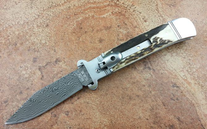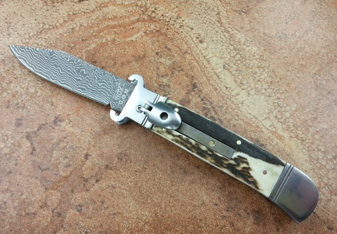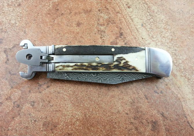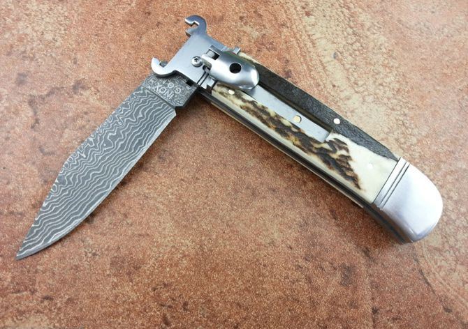 全长:19.6CM 刃长:8.5CM 刃厚:3MM 刃材料:大马士革刃 硬柄材料:双纯钢护手+鹿角 重量:150克 意大利G.O.M古董shell puller 侧跳弹簧刀,经典的杠杆纽扣锁定,弹簧快速打开刀刃,大马士革锋刃,搭配天然鹿角和钢护手,非常经典,极具收藏价值