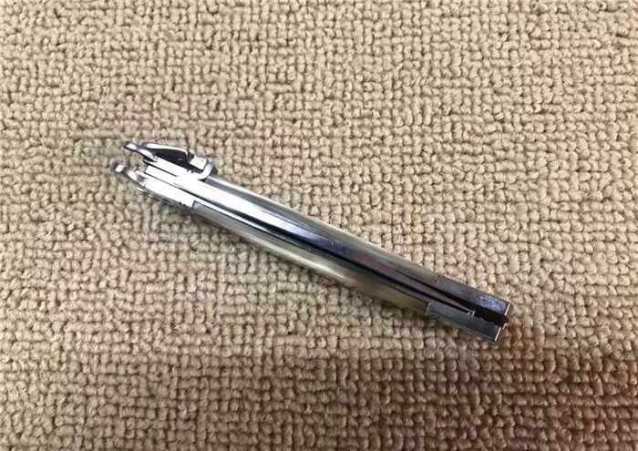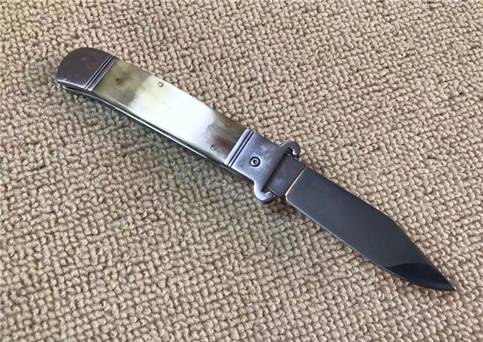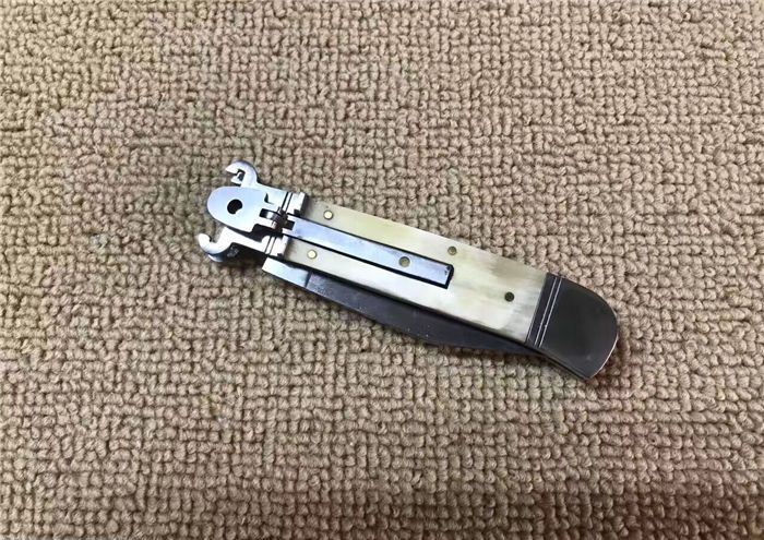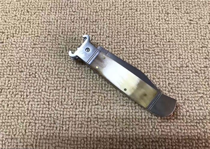 7.7英寸Shell puller古董跳刀(花牛角柄) 全长:19.6CM 刃长:8.5CM 刃厚:3MM 刃材料:440 硬柄材料:双纯钢护手+花牛角
