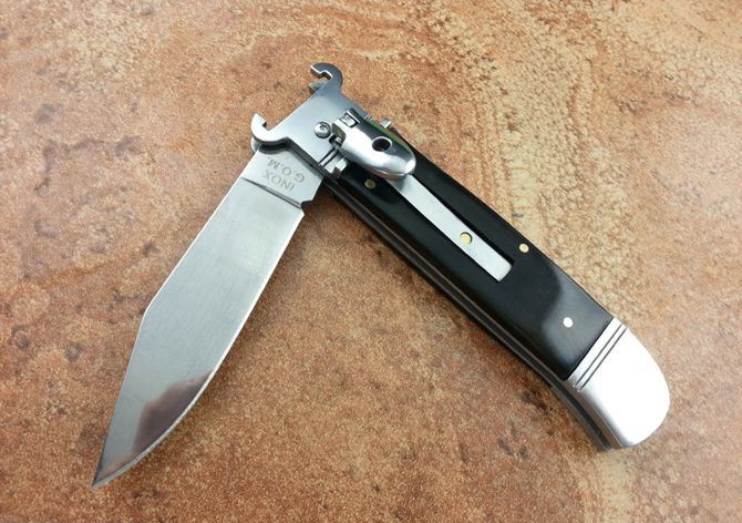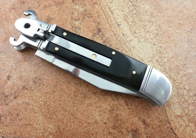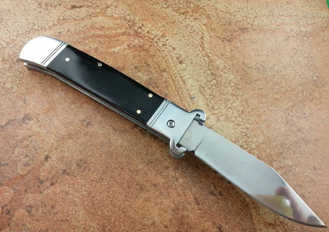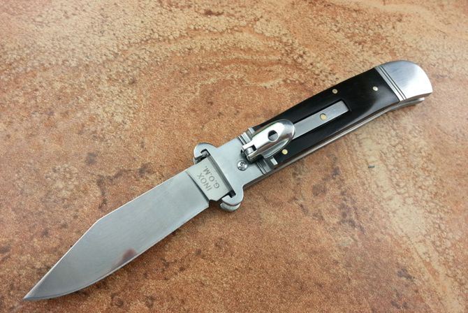 7.7英寸Shell puller 古董跳刀(黑牛角柄) 全长:19.6CM 刃长:8.5CM 刃厚:3MM 刃材料:440 硬柄材料:双纯钢护手+黑牛角 重量:150 克 意大利G.O.M古董shell puller 侧跳弹簧刀,经典的杠杆纽扣锁定,弹簧快速打开刀刃,镜面抛光锋刃,搭配天然黑牛角和钢护手,非常经典,极具收藏价值