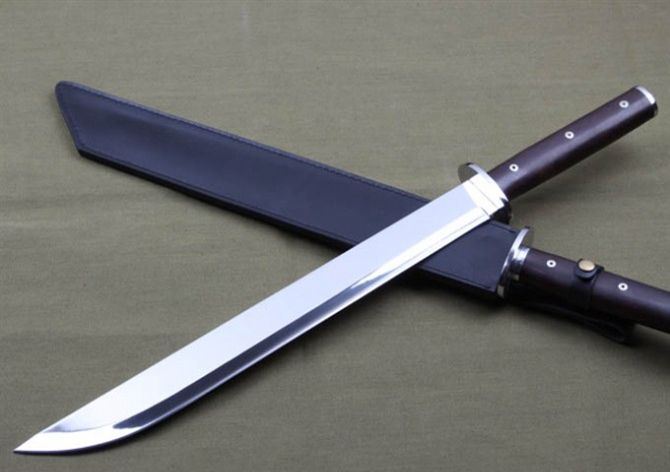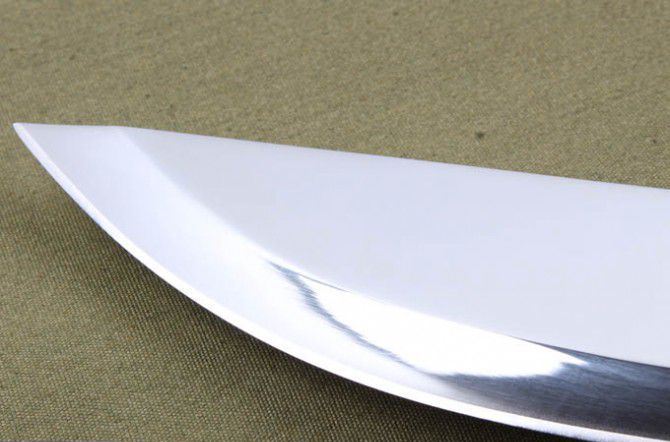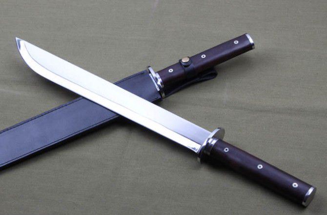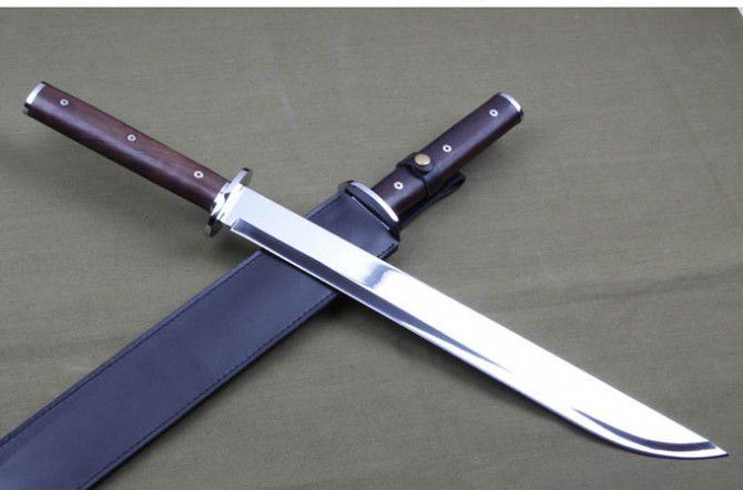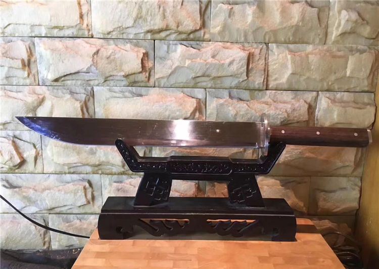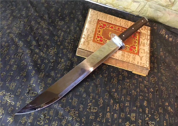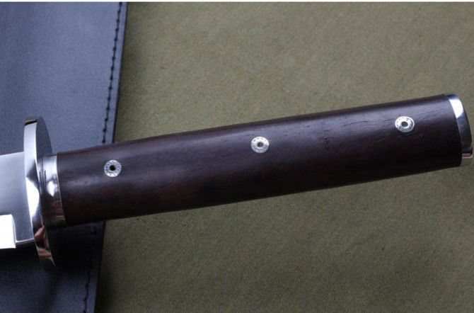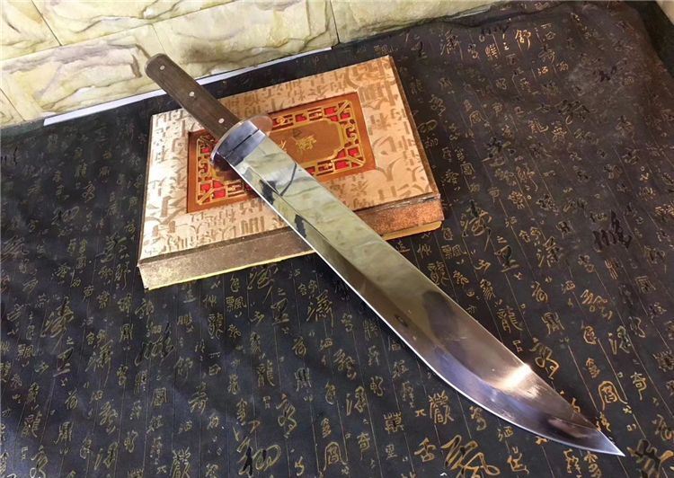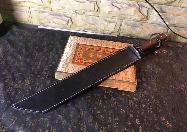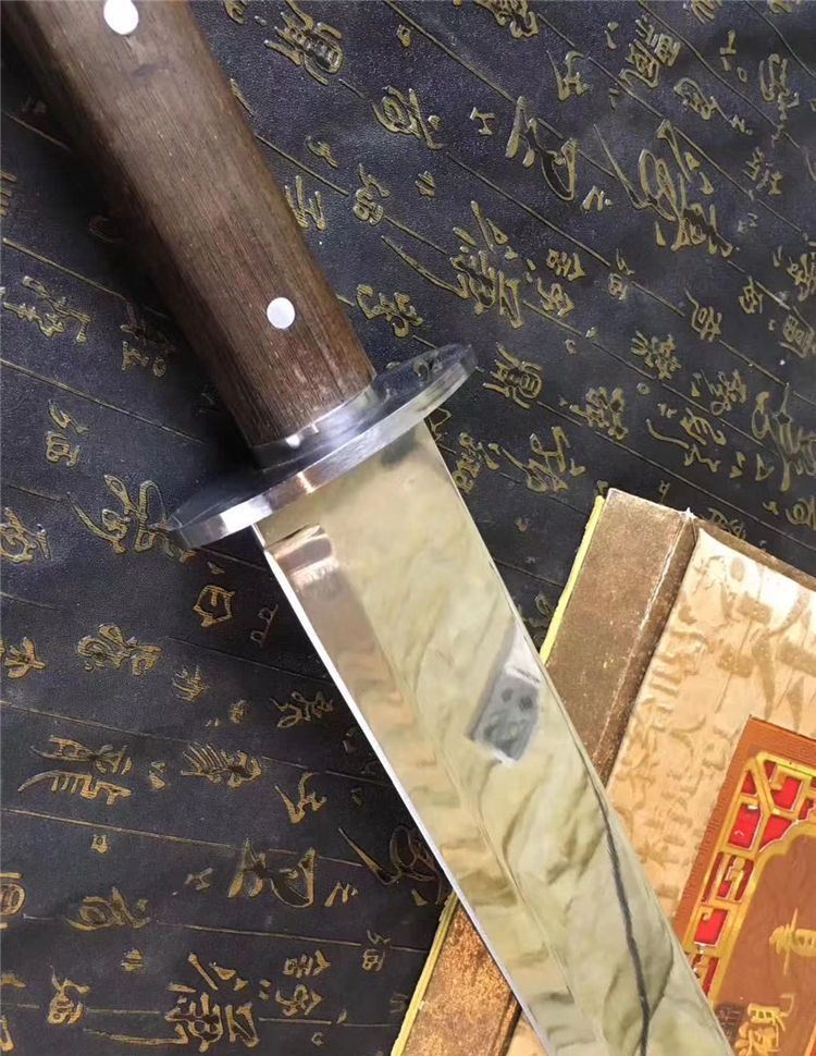 明朝锦衣卫佩刀 (镜光 尖头) 全 长:705mm 刃 长:475mm 柄 长:198mm 刃 宽:50mm 刃 厚:6.5mm 刃 材:5Cr13Mov 重 量:1700g(含包装) 硬 度:57HRC 表 面:镜光 柄 材:黑檀木 锁 型:定锁 其 他:配皮套
