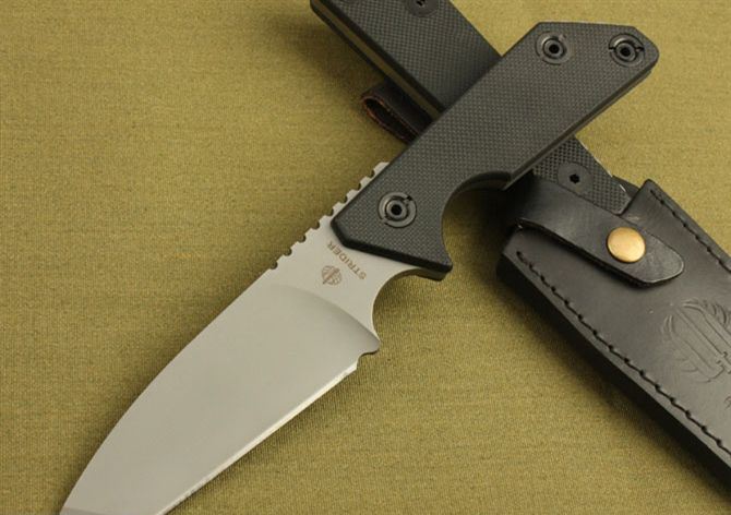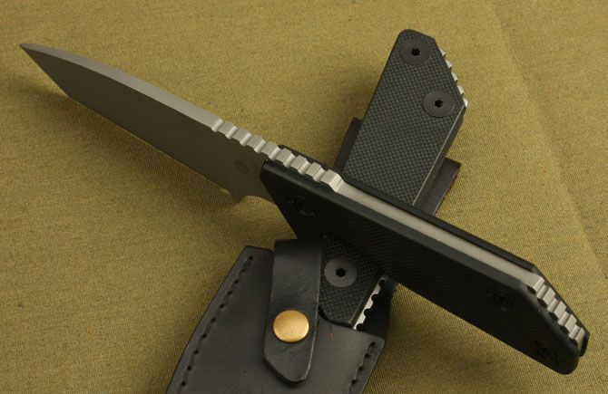 挺进者-骑兵(钛版) 全长:249mm 柄长:128mm 刃厚:5.6mm 硬度:59-60HRC 刃材:9Cr13 表面:灰钛 柄材: 黑G10板 刀鞘: 牛皮 毛重:390g