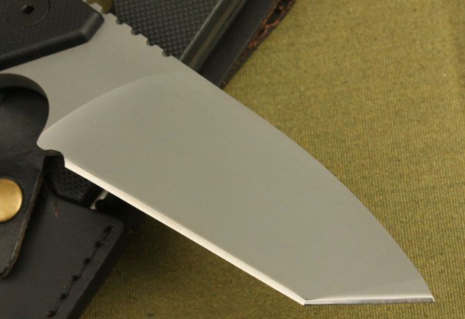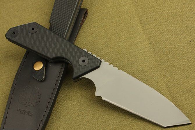 全长:249mm 柄长:128mm 刃厚:5.6mm 硬度:59-60HRC 刃材:9Cr13 表面:灰钛 柄材: 黑G10板 刀鞘: 牛皮 毛重:390g