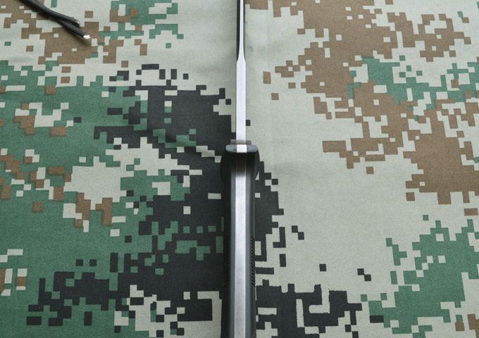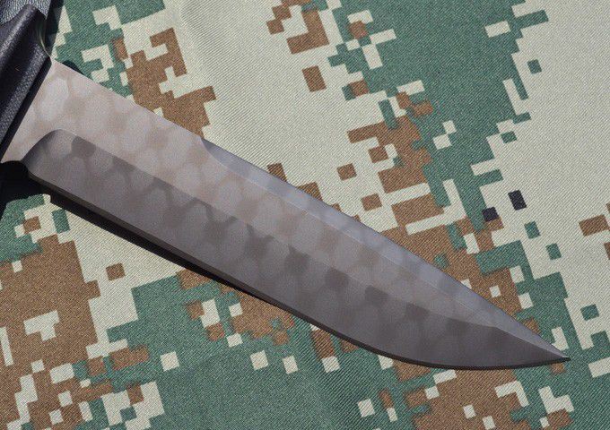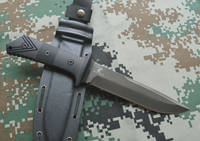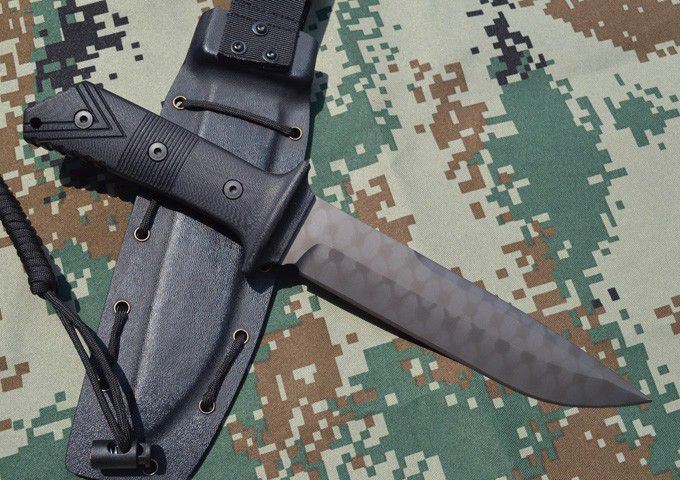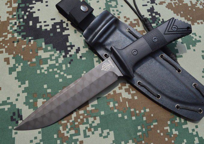 材质:AUS-10A 全长:34.5cm 刃长:19.8cm 柄长: 14.7cm 刃厚:0.6cm 刃宽: 3.8cm 重量: 800克 表面:枪钛+网纹/沧桑石洗 硬度:59-60HRC(真空热处理) 手柄:黑色G10,CNC 成型 刀鞘:战术K鞘(进口Kydex板)