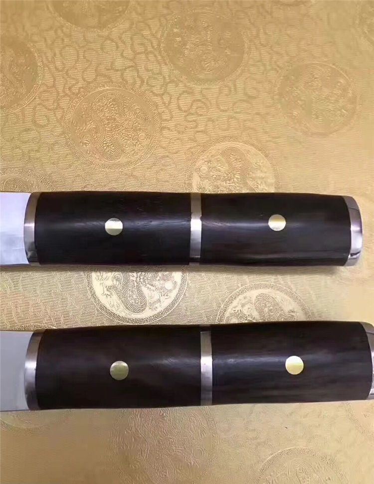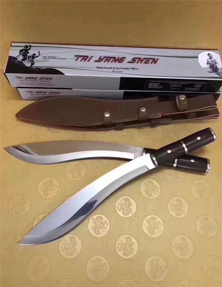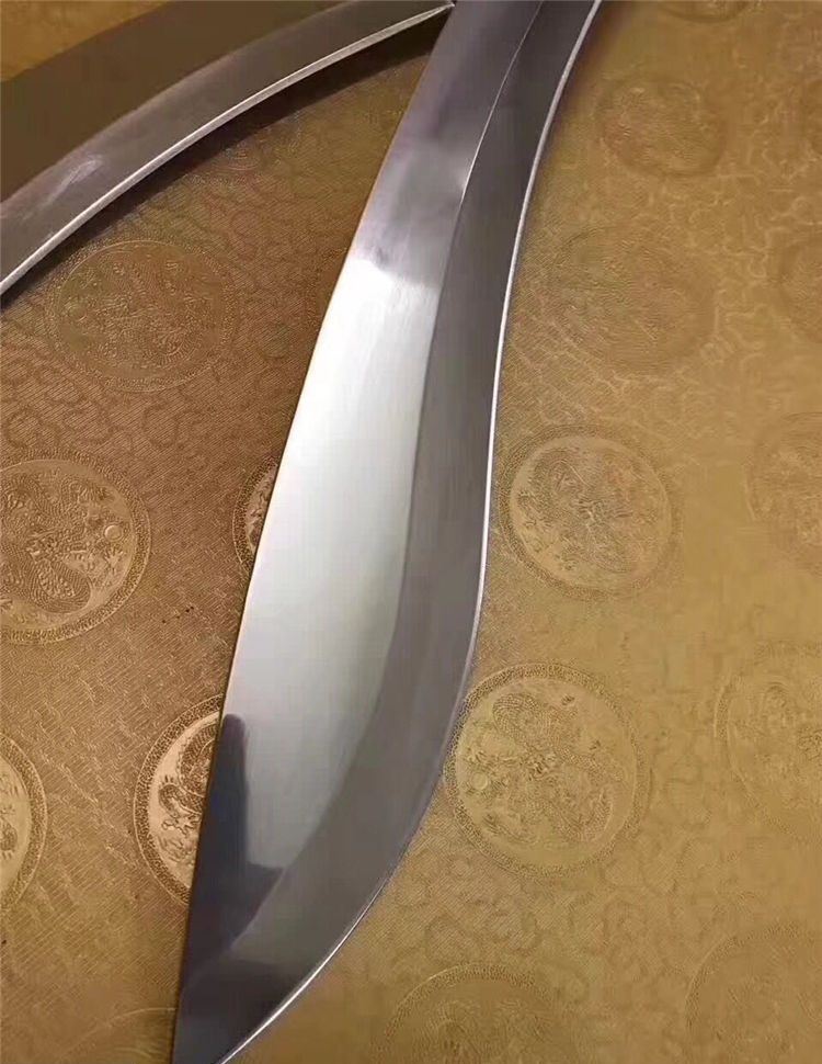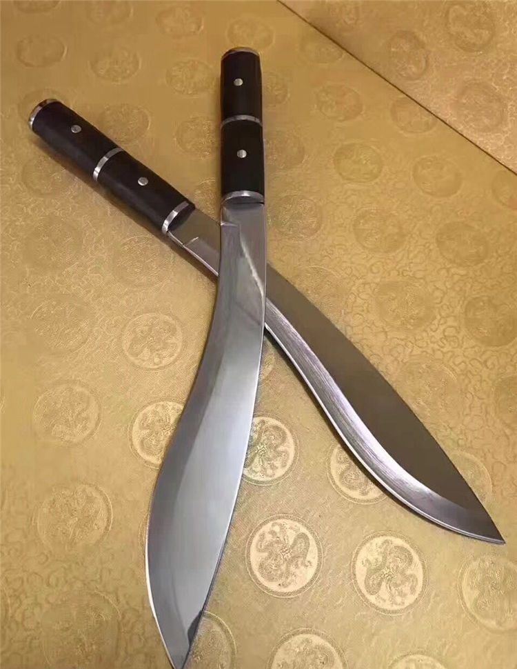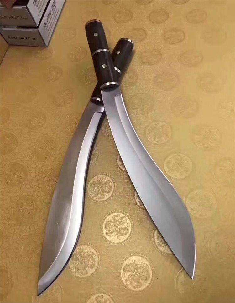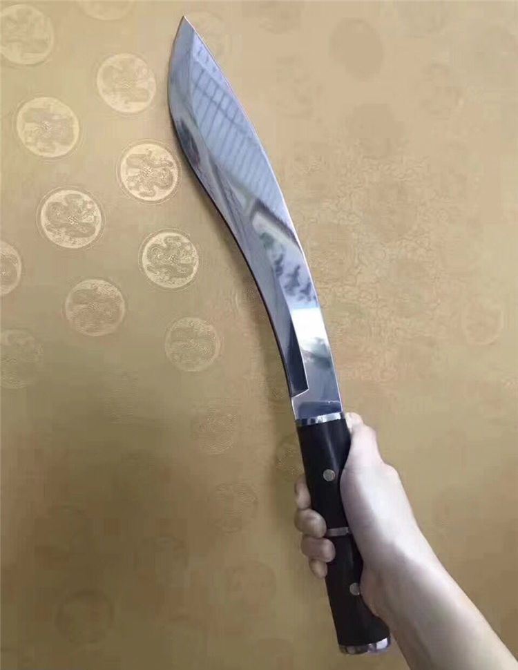 刀奴2—太阳神弯刀( 镜光) 全 长:510mm 刃 长:325mm 柄 长:163mm 刃 宽:60mm 刃 厚:5.3mm 刃 材:5Cr13Mov 重 量:960g(含包装) 硬 度:57HRC 表 面:镜光 柄 材:钢+黑檀木 锁 型:定锁 其 他:配皮套