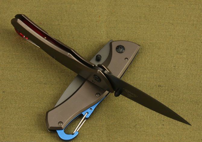 刃材:3Cr13 硬度: 56HRC 全长:19CM 刃长:7.7CM 刃厚: 0.27CM 刃宽:2.5CM (最宽处) 柄长: 11.5CM 涂层:钛版 柄材: 钢柄 重量:140克 锁定: 边锁