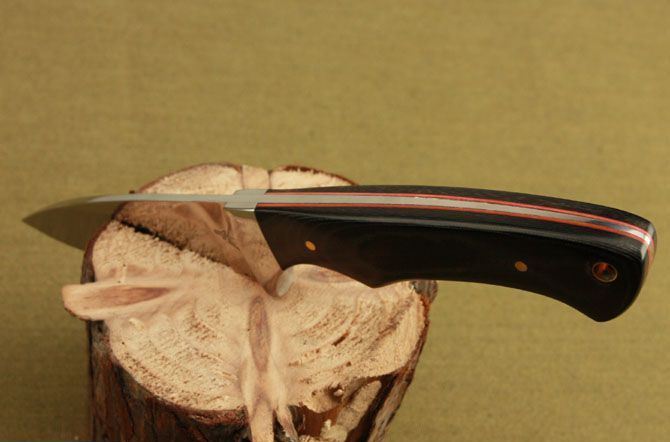 全长:17.5cm 刃长:7.5cm 柄长:10cm 刃厚:2.7mm 重量:100g(含包装) 刃材:7Cr17 硬度:58-60HRC 表面处理:镜光 柄材:米卡塔+红G10