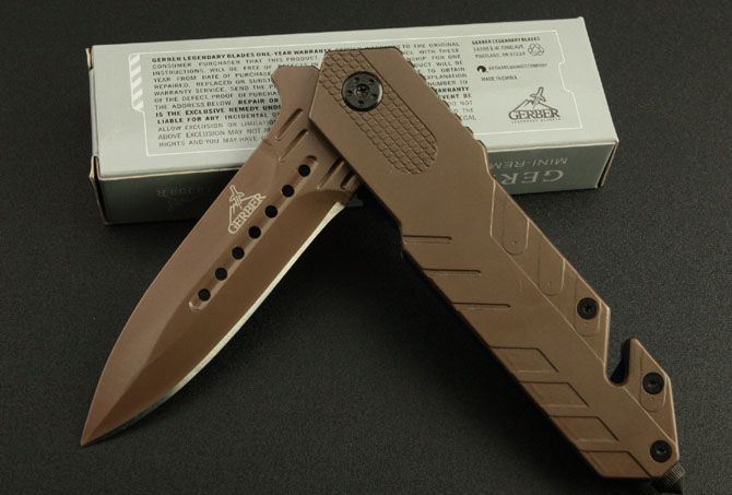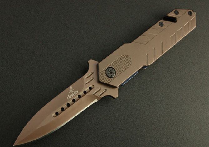 戈博—X19折刀 全 长:22.5cm 刃 长:9cm 柄 长:13cm 刃 宽:2.5cm(最宽处) 刃 厚:3.8mm 刃 材:3Cr13 硬 度:55HRC 刀 柄:钢 表 面:镀钛 重 量:240克 锁定方式:快开