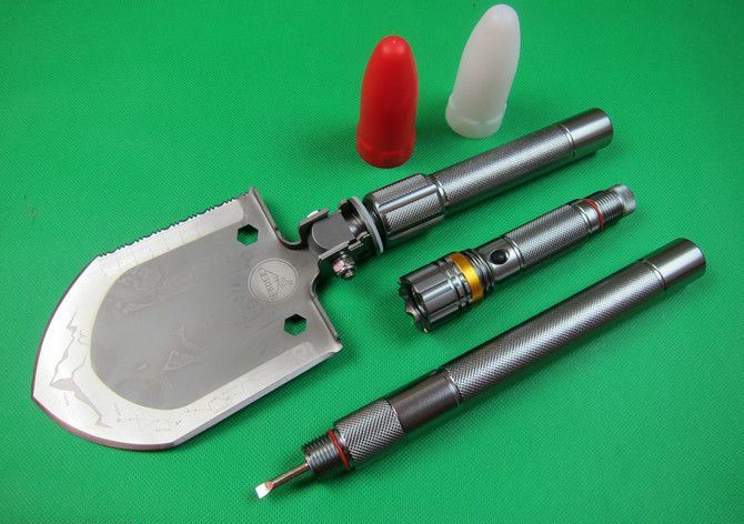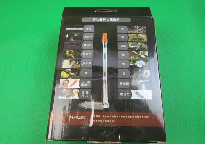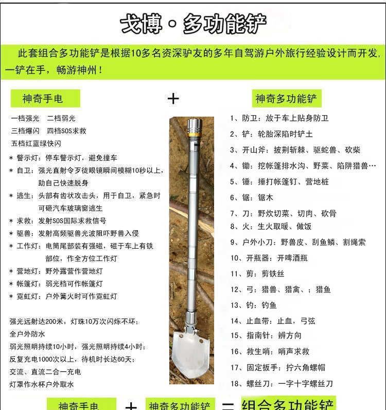 戈博.多功能铲 尺寸:总长75CM 刃厚;21MM 重量;1630克(含包装) 材质:航空镁铝 又轻有结实 表面:镀钛处理 防滑滚花 丝口:做工精密 有密封垫圈锹头 材质:进口特种刀具钢 锹头硬度:HRC 48-52 产品工艺:真空淬火,高温氮化处理 包装盒尺寸:230MM*180MM*88MM