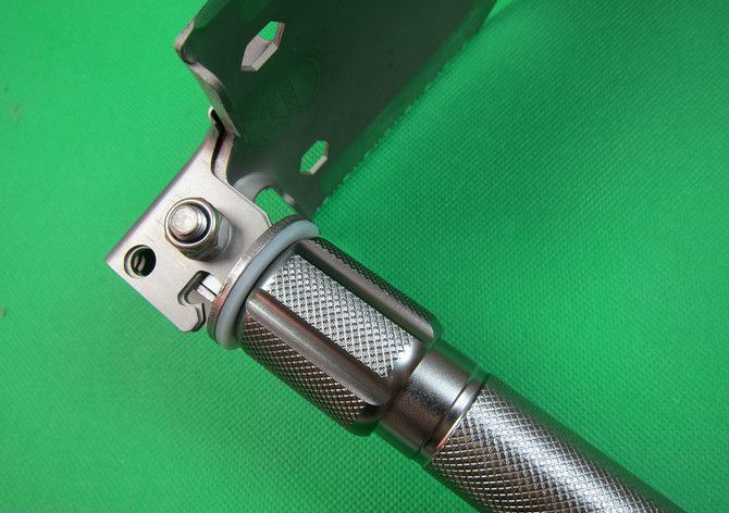 尺寸:总长75CM 刃厚;21MM 重量;1630克(含包装) 材质:航空镁铝 又轻有结实 表面:镀钛处理 防滑滚花 丝口:做工精密 有密封垫圈锹头 材质:进口特种刀具钢 锹头硬度:HRC 48-52 产品工艺:真空淬火,高温氮化处理 包装盒尺寸:230MM*180MM*88MM