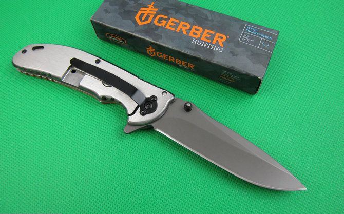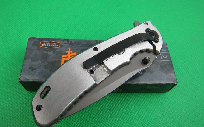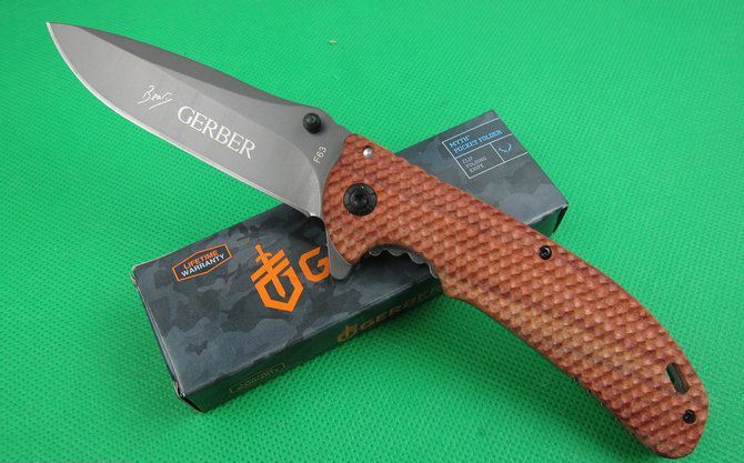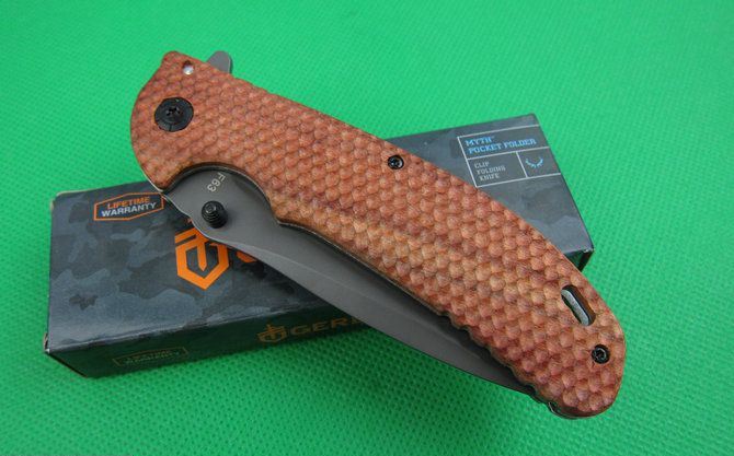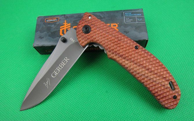 戈博F63快开折刀 全 长:22cm 刃 长:10cm 刃 宽:2.7cm(最宽处) 刃 厚:2.9mm 柄 长:12.8cm 表 面: 镀钛 刃 材: 5CR13MOV 硬 度: 57HRC 柄 材: 实木+拉丝钢片 重 量:170克(含彩盒子), 锁 闭:快开 备 注:带腰夹