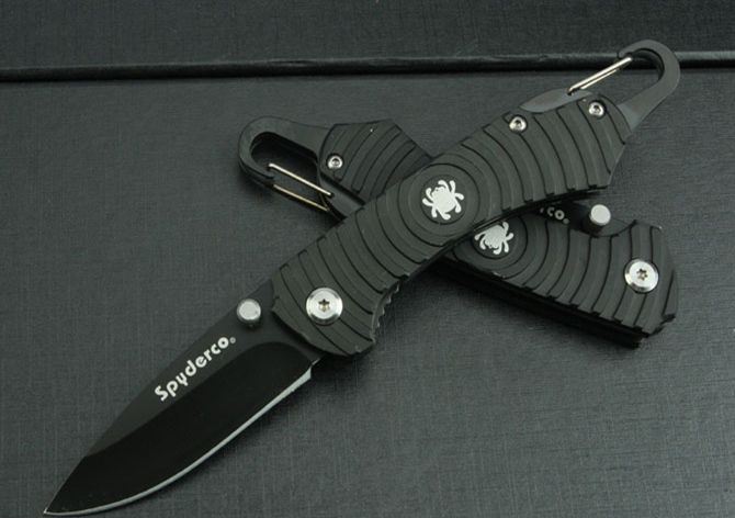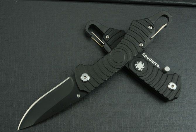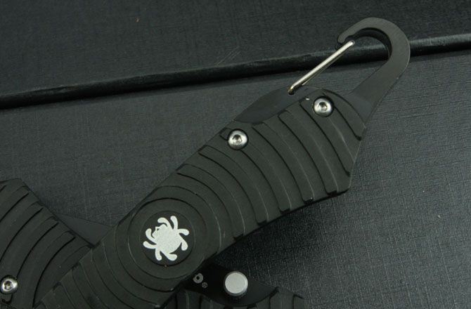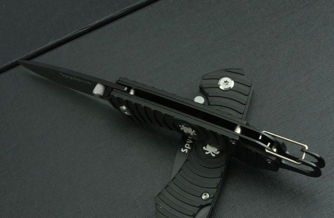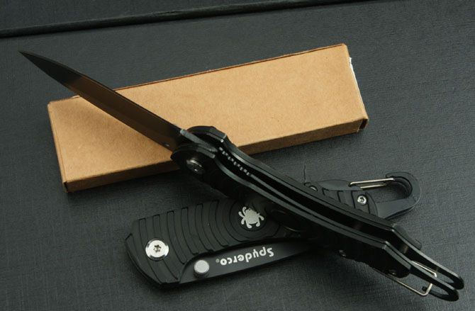 蜘蛛—165AM登山扣折刀 全 长:170mm 刃 长:63mm 柄 长:107mm 刃 宽:23mm 刃 厚:2.3mm 刃 材:5Cr13Mov 重 量:75g(含包装) 硬 度:57HRC 表 面:氧化黑 柄 材:铝扎成形 锁 型:线锁 其 他:精冲成形.高品质.配牛皮纸盒