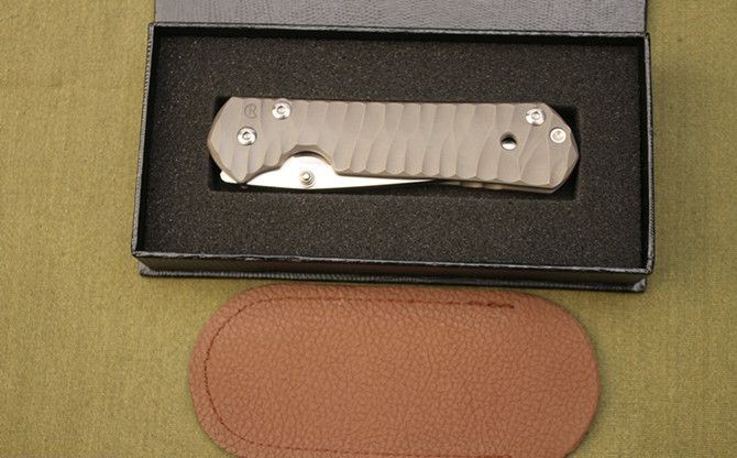 全 长:21cm 刃 长:9cm 柄 长:12cm 刃 宽:2.7cm(最宽处) 刃 厚:3.4mm 刃 材:D2高速钢 硬 度:60-62HRC 刀 柄:钛合金 表 面:砂光 锁定方式:侧锁 重 量:220克(含包装) 备 注:配礼盒
