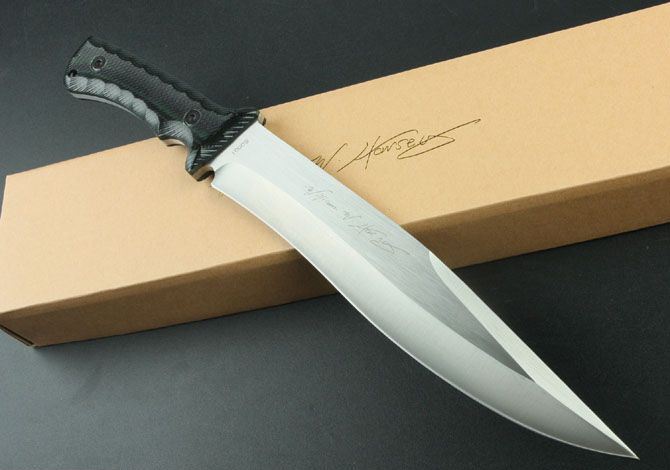 克里斯里夫—手签版野战开路刀 全长:41.5CM 刃长:28CM 刃材:5Cr13 硬度:57HRC 刃厚:0.57CM 刃宽:4.5CM (最宽处) 柄长:13CM 重量:890g(含包装) 涂层:砂光 柄材:米卡塔 刀鞘:皮套