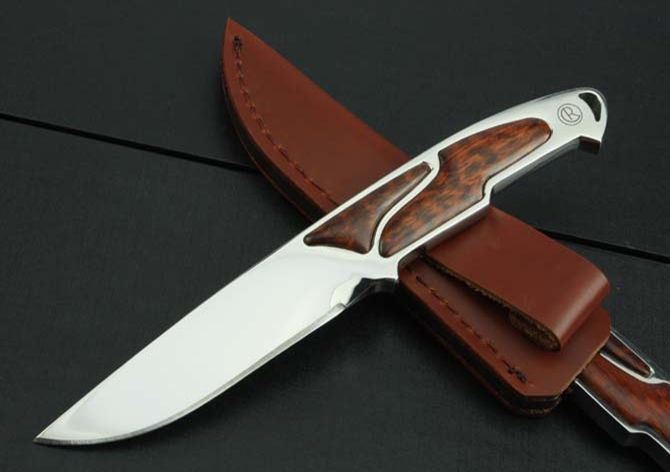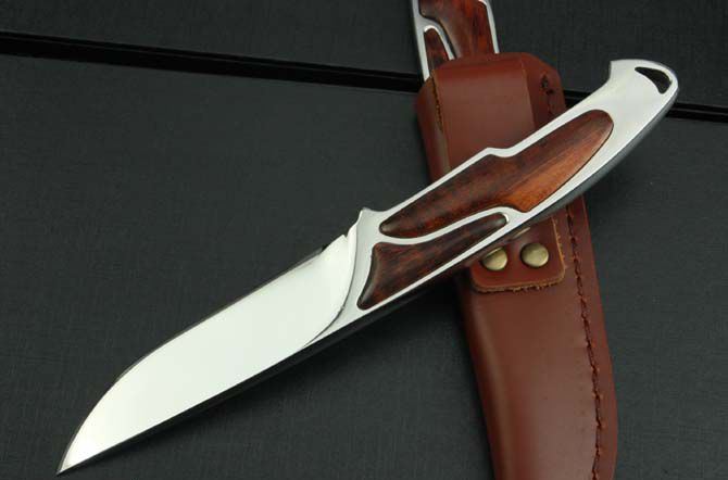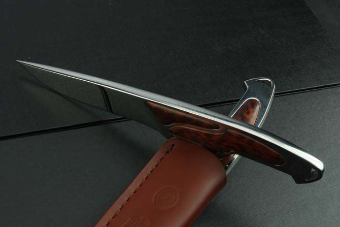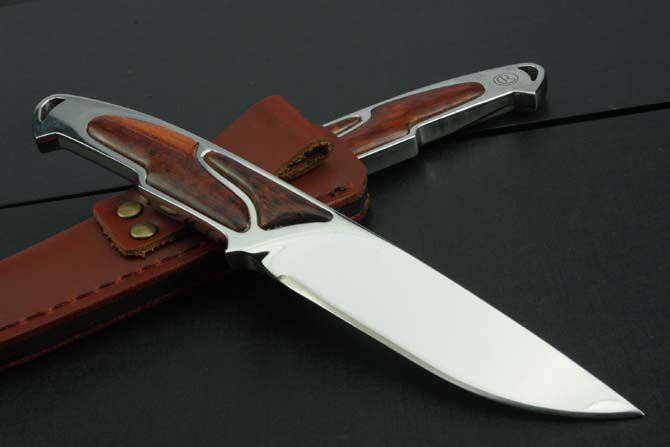 克里斯里夫一体钢闪闪镜光直刀 全长:21cm 刃长:10.0cm 柄长:11cm 刃厚:7.6mm 刃宽:2.6cm 刃材:8Cr18Mov 柄材:刀身贯穿刀柄,精镶蛇纹木,全由电脑椤出来,手工精密,难得是一把收藏名刀。 硬度:58HRC 净重:170g 毛重:370g(含套和原厂盒) 表面:超镜光 刀套:皮套
