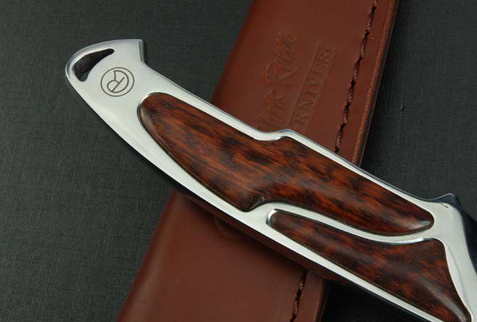 全长:21cm 刃长:10.0cm 柄长:11cm 刃厚:7.6mm 刃宽:2.6cm 刃材:8Cr18Mov 柄材:刀身贯穿刀柄,精镶蛇纹木,全由电脑椤出来,手工精密,难得是一把收藏名刀。 硬度:58HRC 净重:170g 毛重:370g(含套和原厂盒) 表面:超镜光 刀套:皮套