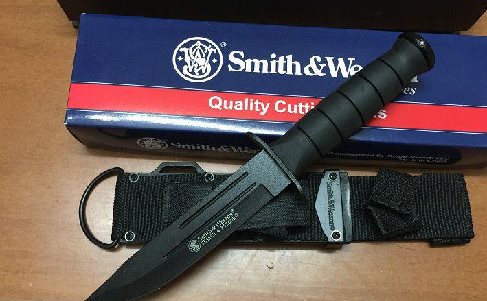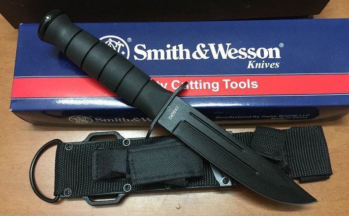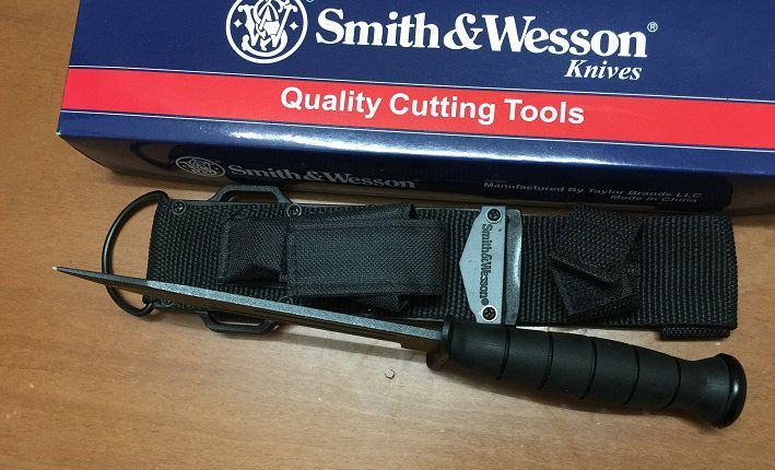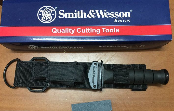全长:26.5cm 刃长:14cm 刃宽:3cm 刃厚:0.42cm 刃材:440 硬度:57HRC 表面:喷粗砂 柄材:橡胶 柄长:11.5cm 结构:刀身贯穿刀柄,钢钉固定,非常牢固。 净重:220克 毛重:500克 附件:专用战术尼龙套,史密斯.威森原装专用钢砂磨刀器 包装:原装正品包装 正品说明书(俗称“出世纸”) 品质:OEM代工正品