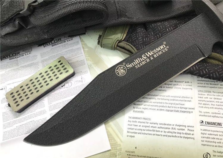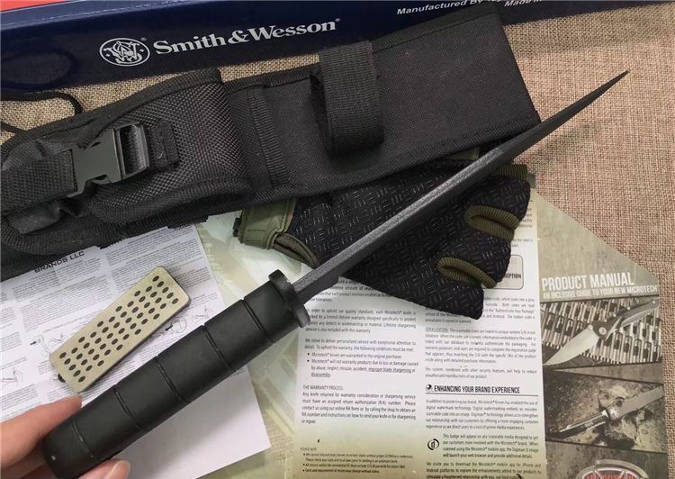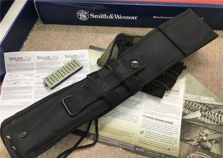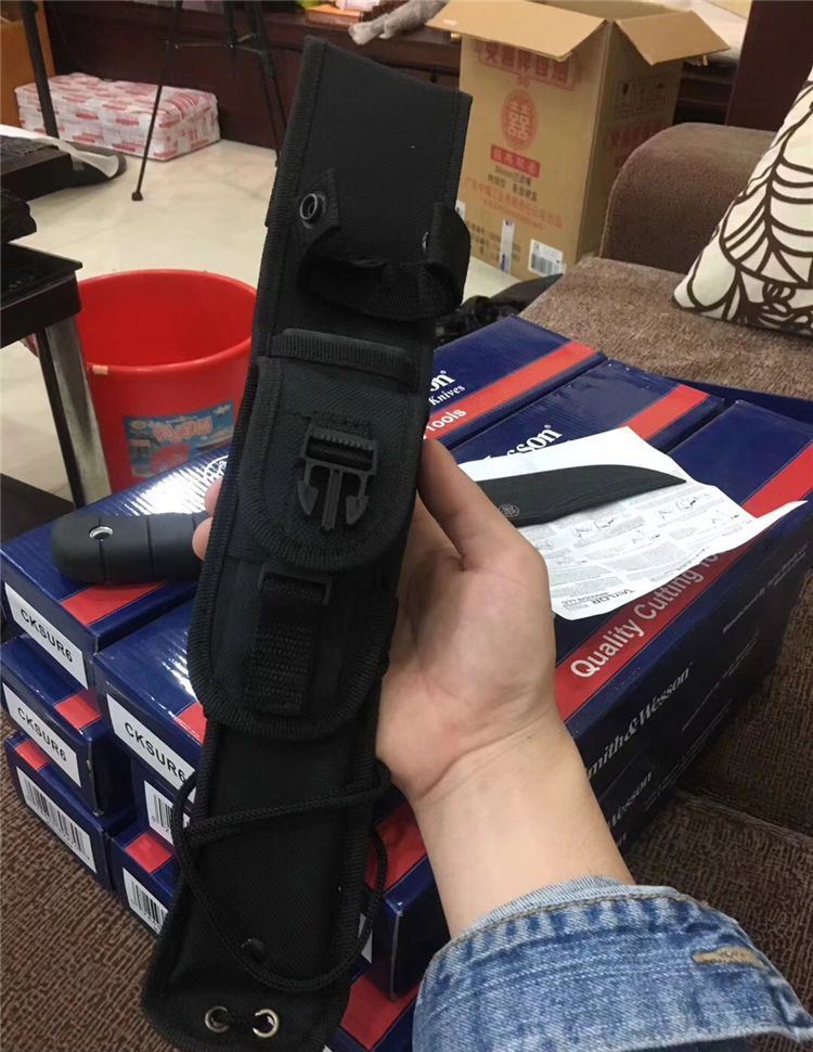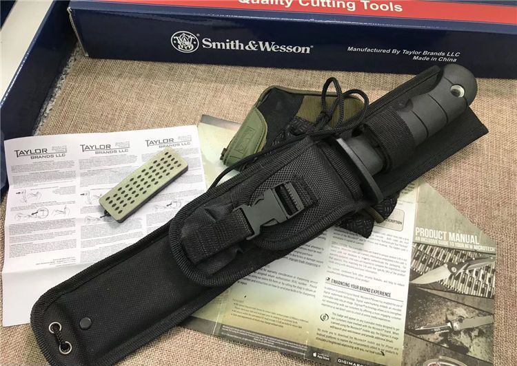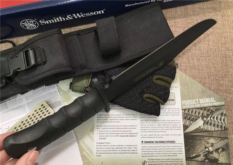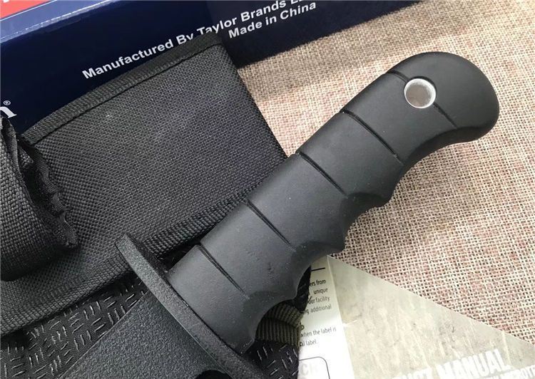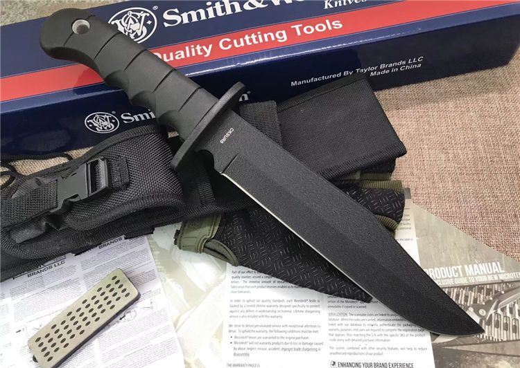 史密斯6号直刀 全长:35cm 刃长:19.5cm 刃宽:4.2cm 刃厚:0.55cm 刃材:440C 硬度:57HRC 表面:特氟龙 柄材:橡胶 柄长:13cm 结构:刀身贯穿刀柄,铜钉固定,非常牢固。 毛重:700克 附件:专用战术尼龙套