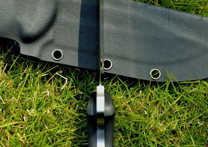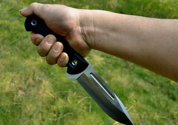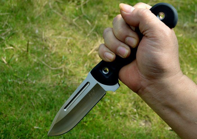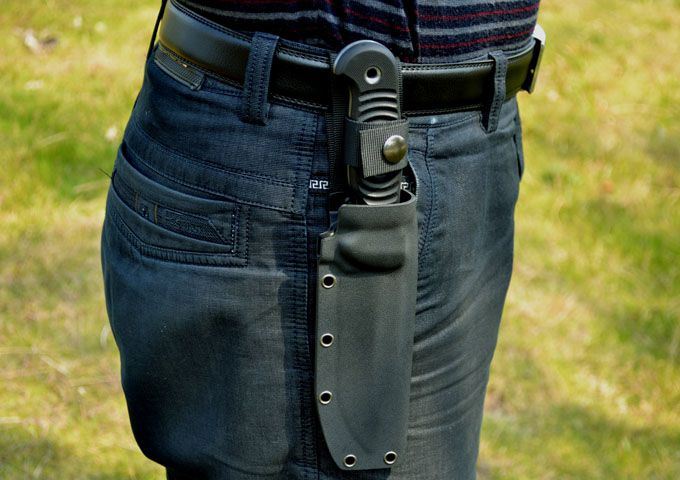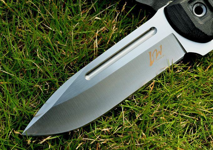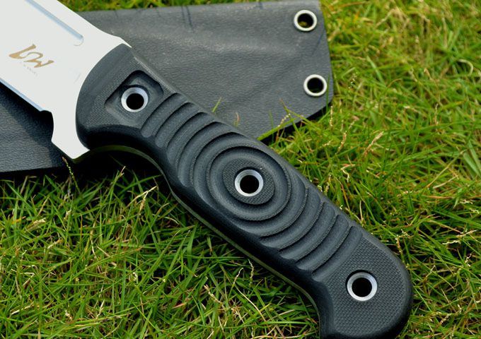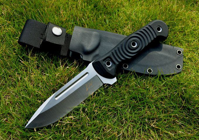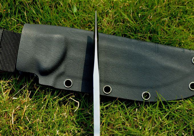 刃材:9Cr18M0v(含钴) 全长:24.5cm 刃长:11.9cm 刃厚:0.47cm 表面:精细砂光、拉丝 硬度:58-60hrc (真空油淬热处理) 手柄:G-10 刀鞘:进口Kydex鞘