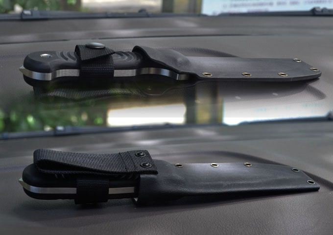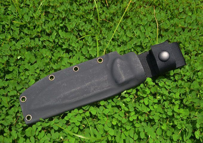 刃材:9Cr18M0V(含钴) 全长:24.5cm 刃长:11.9cm 刃厚:0.47cm 表面:精细砂光、拉丝 硬度:58-60hrc (真空油淬热处理) 手柄:G-10 刀鞘:进口Kydex鞘
