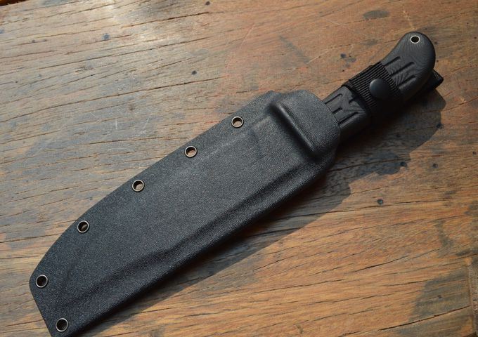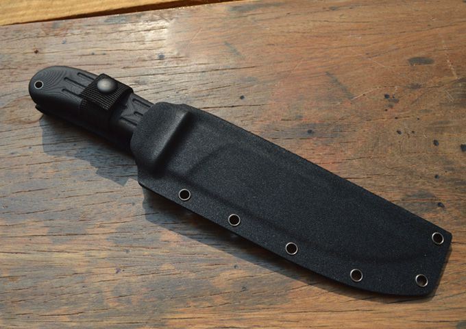 刃材:A2 全长:310mm 刃长:190mm 刃厚:6.0mm 刃宽:41mm 表面:石洗 硬度:HRC59-60 (真空油淬热处理) 手柄:G-10+表面防滑处理 刀鞘:进口Kydex鞘