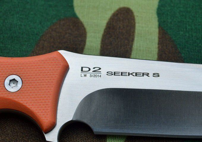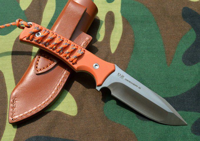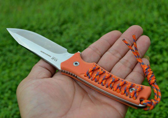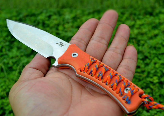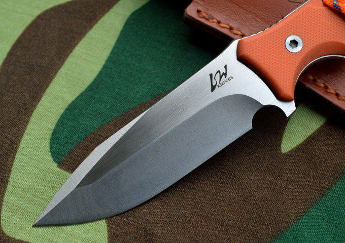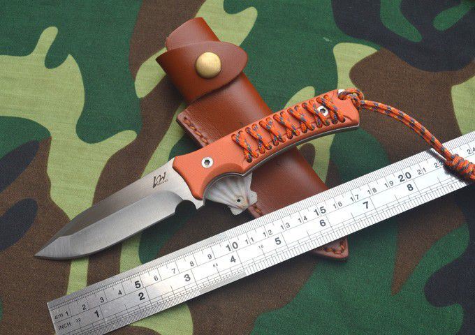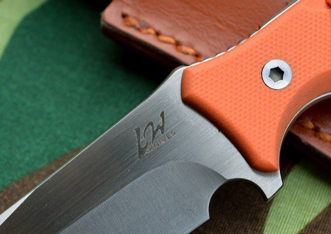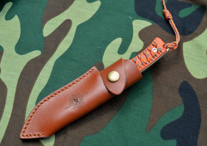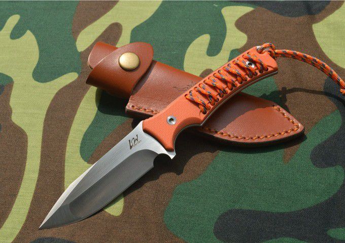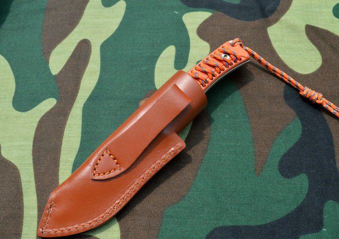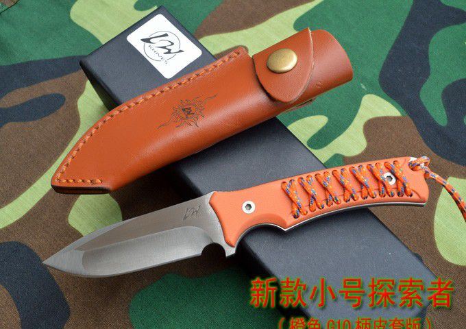 L.W(利威)-新款小号探索者小直/橙色G10柄/皮套版 刃材:D2 全长:190mm 刃长:90mm 刃宽:28mm(最宽处) 刃厚:4.0mm 表面:砂光+拉丝 硬度:59-60hrc (真空油淬热处理) 手柄:橙色G10柄 + LW首创伞绳绕法 刀鞘:头层牛皮套