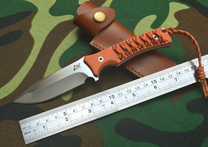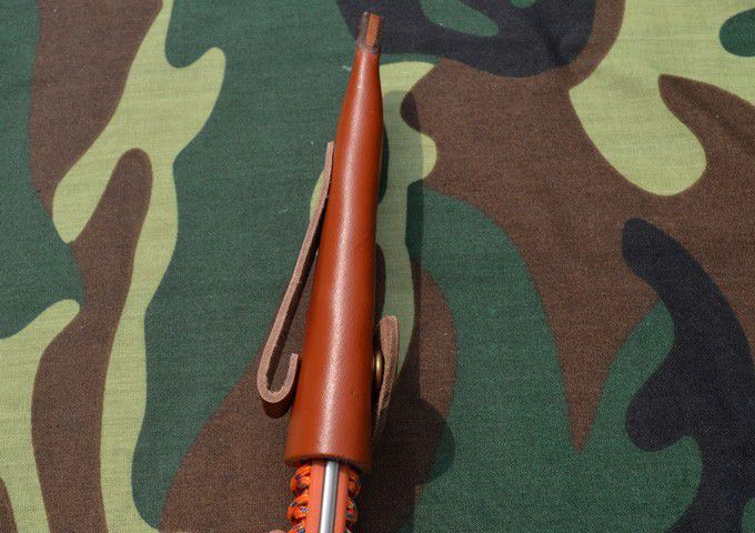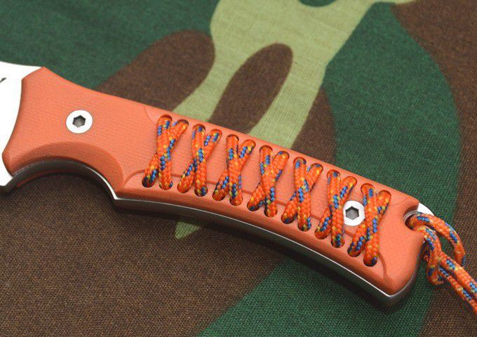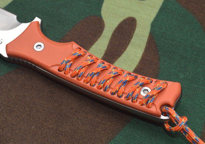 刃材:D2 全长:190mm 刃长:90mm 刃宽:28mm(最宽处) 刃厚:4.0mm 表面:砂光+拉丝 硬度:59-60hrc (真空油淬热处理) 手柄:橙色G10柄 + LW首创伞绳绕法 刀鞘:头层牛皮套