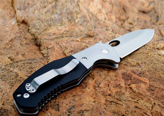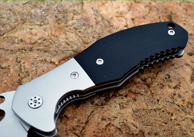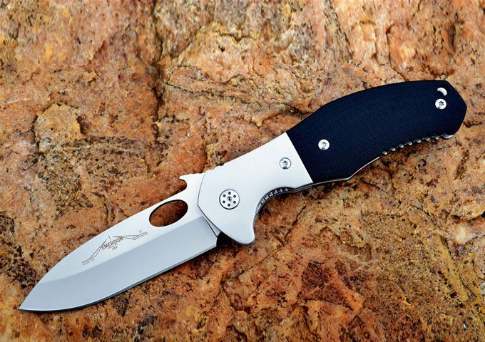 (随风代工版)爱默生CQC10折刀 全长:216mm 刃长:91.5mm 刃厚:3.5mm 刃宽: 29mm 刃材: 440C(表面镀灰钛) 柄材: 钢头+黑色G10 刀刃硬度: HRC58-60 包装:黄色纸盒 重量:220G/盒