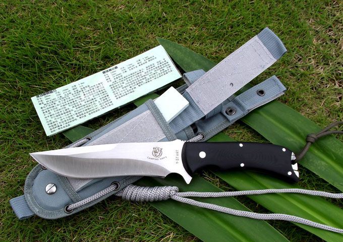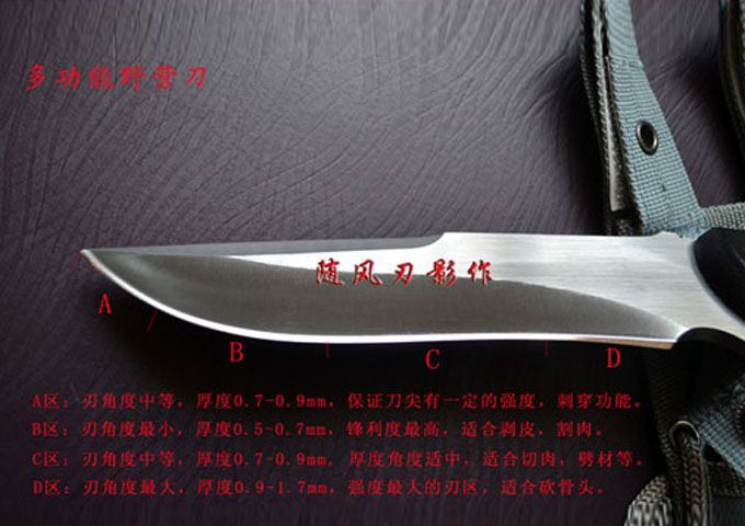 随风版-多功能野营刀 全长:300mm 刃长:163mm 刃厚:5.0mm 刃宽: 40mm 刃材: ATS-34 柄材: G10 硬度: 60-61HRC 刀套:尼龙鞘 包装:纸盒包装(配目录一张)