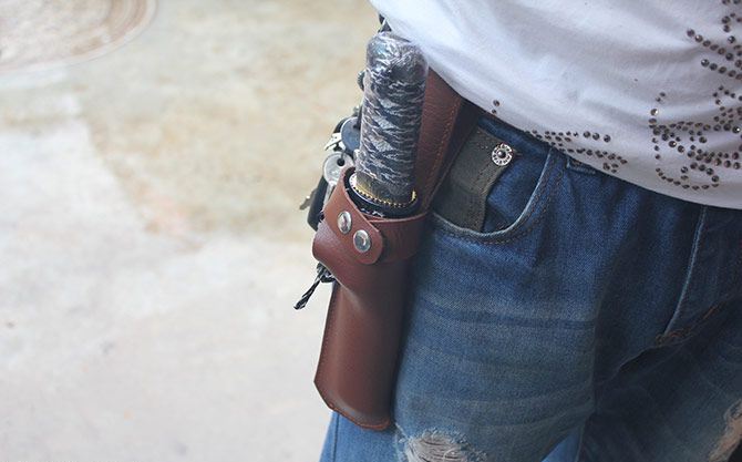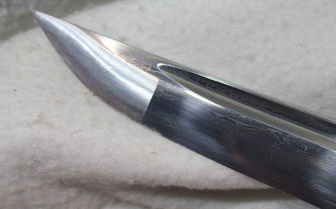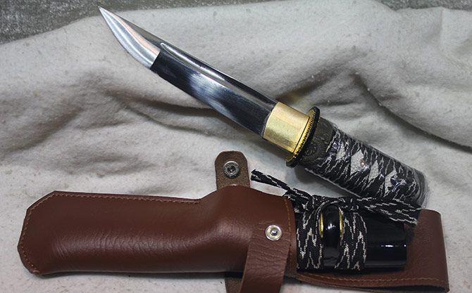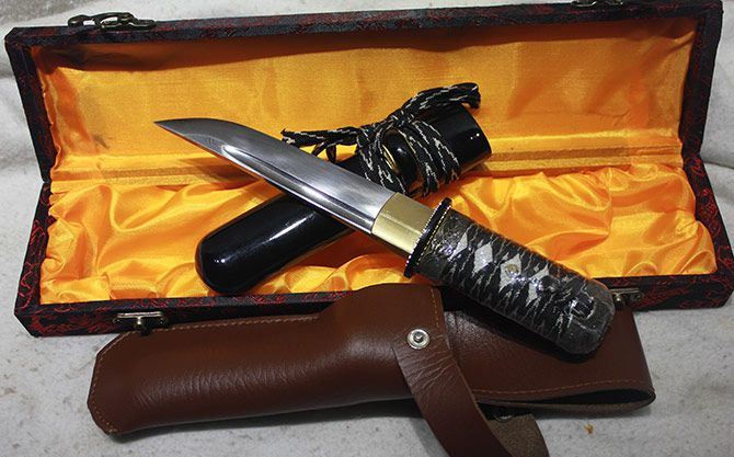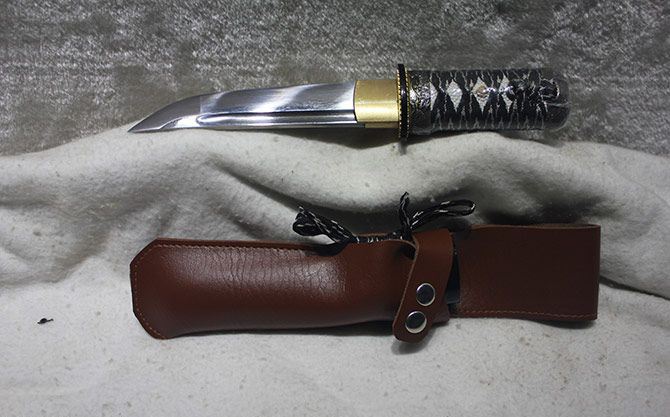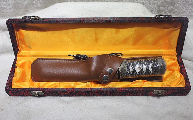 皮套带鞘特小武士刀(花纹钢) 全长:23.5cm 刃长:14cm 刃宽:2.8cm 刃厚:6mm 刃材:花纹钢 柄长: 8.5cm 鞘材:青皮木,亮光黑漆、纯棉绑绳。 装材:铜装 柄材:纯棉绑绳、带木钉、可拆卸。 硬度区间:60HRC 总重:540克(含包装) 性能:全开锋 包装:带锦盒、皮套。 备注:手工产品存在误差,规格仅供参考,请以实物为准! 温馨提示:本品不含刀架,刀架需另购,谢谢!