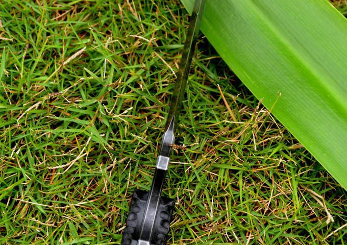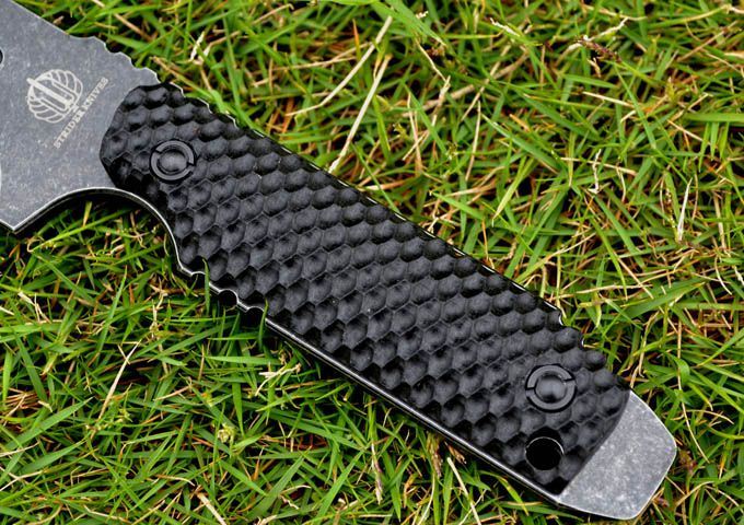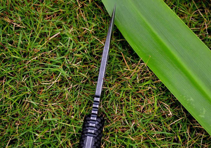 百炼DUK3—STRIDER尖兵(枪钛/石洗版) 长 度:230MM 宽 度:5.0MM 厚 度:5MM 硬 度:59 材 质:GB-D2 打磨方式:小凹 表面处理:枪钛,经典石洗. 热 处 理:高温真空淬火、低温回火! 配 件:K鞘、战术腰夹