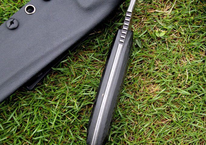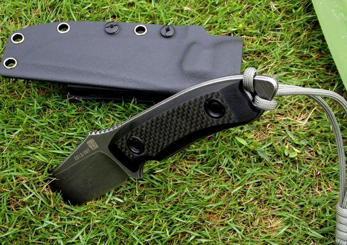 百炼EDC生存Ⅱ之刀耕火种(2013版) 材质:9CR18MOV (锻打) 刃面打磨:高腰V磨 热 处 理:真空+深冷处理 主要性能:切,割,削为主,超凡耐磨性保持性 硬度:60±1HRC 表面处理:怀旧亚光处理 手柄:碳纤维表层G10手柄 尺寸: 全长: 220MM; 刃长: 105MM; 刃厚: 4.5MM. 配件:加厚K鞘、携带系统