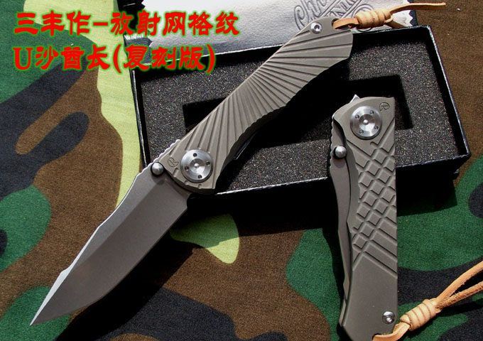三丰作—Sebenza放射网格纹U沙酋长(复刻版) 全长:212mm 折合:121mm 刃长:91mm 刃宽:28mm 刃厚:3.5mm 柄厚:12mm 重量:137g 刃材:进口440C 硬度:59-60HRC 刃面:丝光石洗 柄材:钛合金TC4(放射/网状纹) 刀夹:整体钛合金切削 定位珠:德国FAG陶瓷定位珠 钛合金锁定面做热处理硬度HRC45 铜垫片 包装:黑色礼品盒