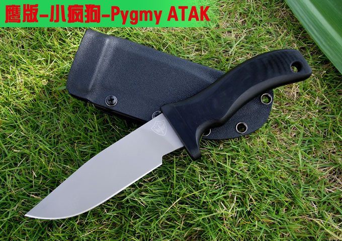 鹰版-小疯狗Pygmy ATAK 全 长:23.9cm 刃 长:12.7cm 柄 长:11.2cm 刃 材:德国D2钢 硬 度:59-60HRC 刃 厚:5mm 表 面:灰钛 柄 材:玻璃纤维与环氧基树脂合成材料(G10) 磨 法:大平磨 刀 鞘:Kydex (进口K板刀鞘)
