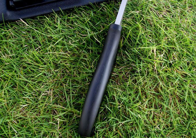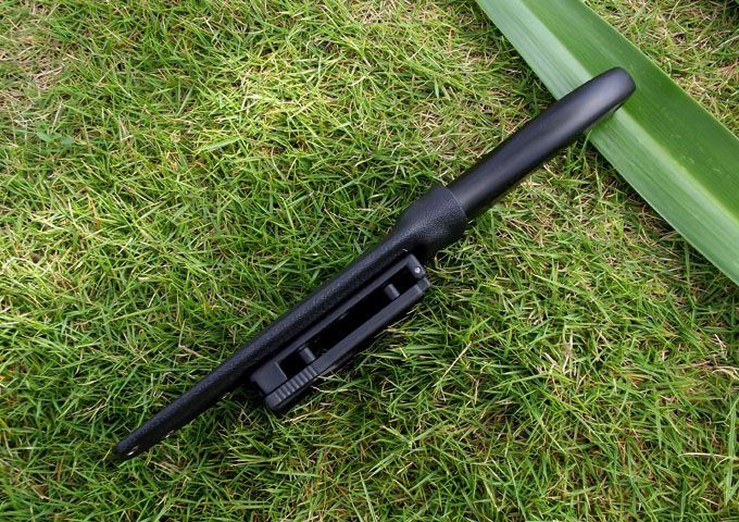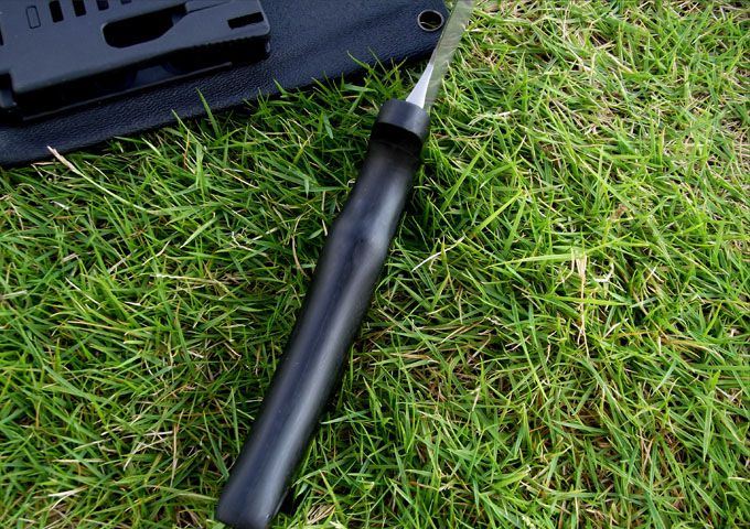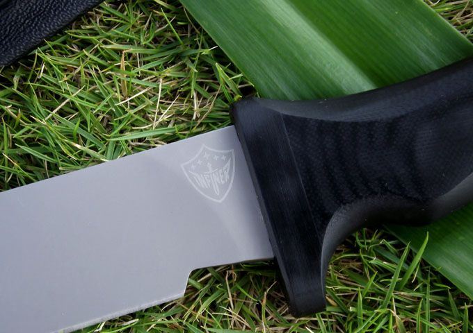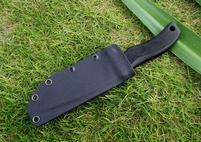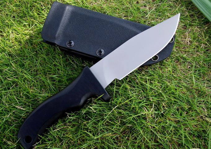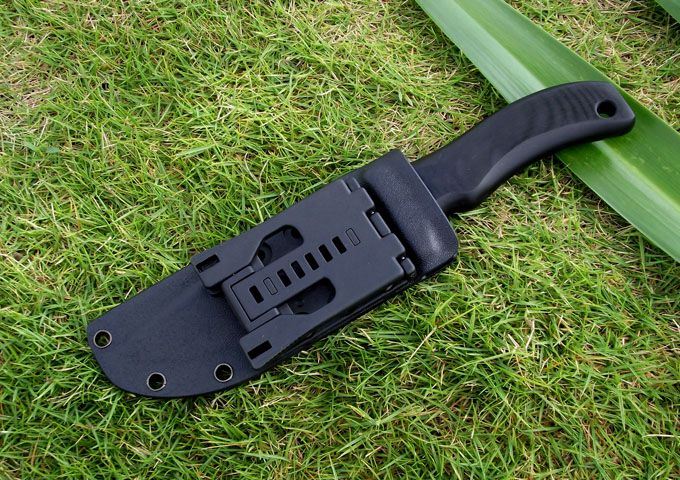 全 长:23.9cm 刃 长:12.7cm 柄 长:11.2cm 刃 材:德国D2钢 硬 度:59-60HRC 刃 厚:5mm 表 面:灰钛 柄 材:玻璃纤维与环氧基树脂合成材料(G10) 磨 法:大平磨 刀 鞘:Kydex (进口K板刀鞘)